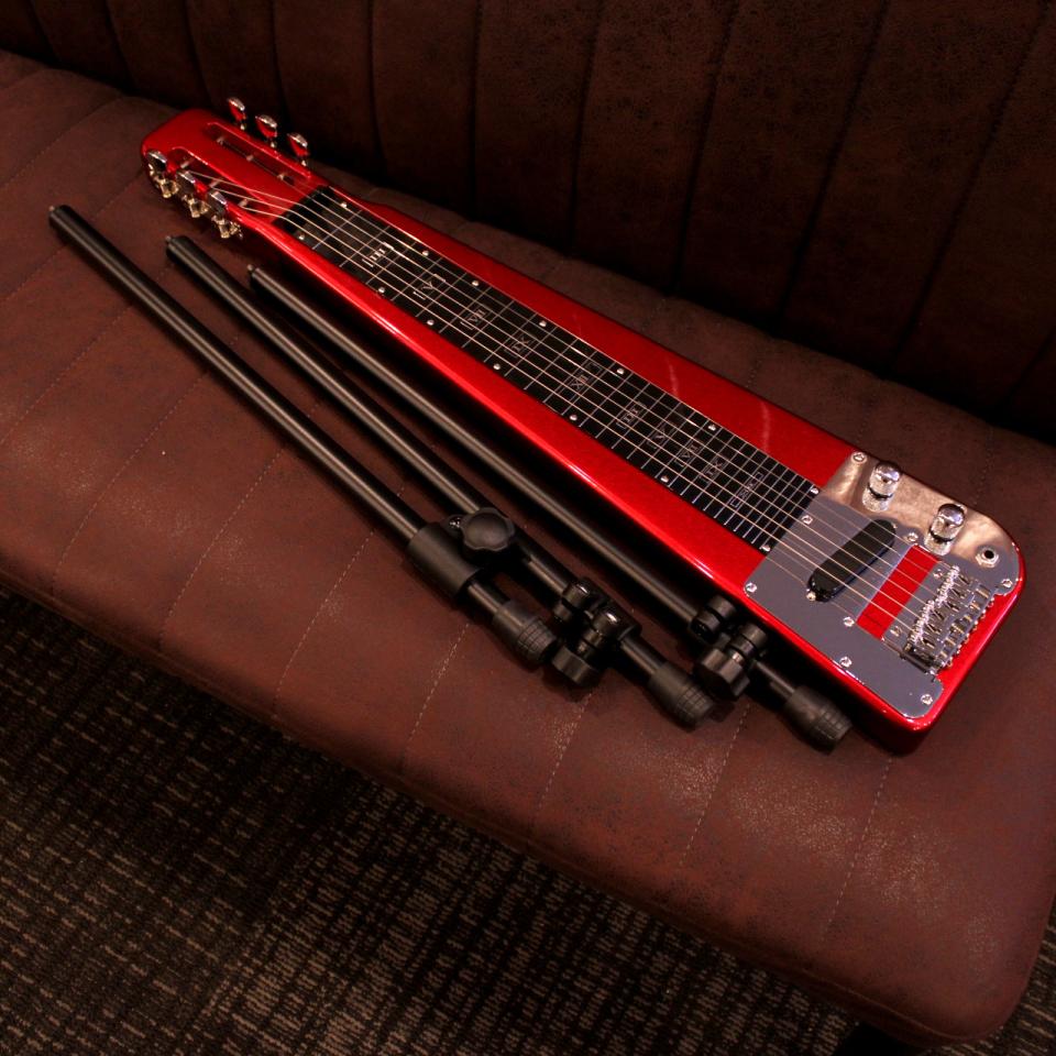 6弦仕様のスチールギター。膝の上に構えるスタイルはもちろん、付属の専用スタンドを使用することで立奏にも対応。