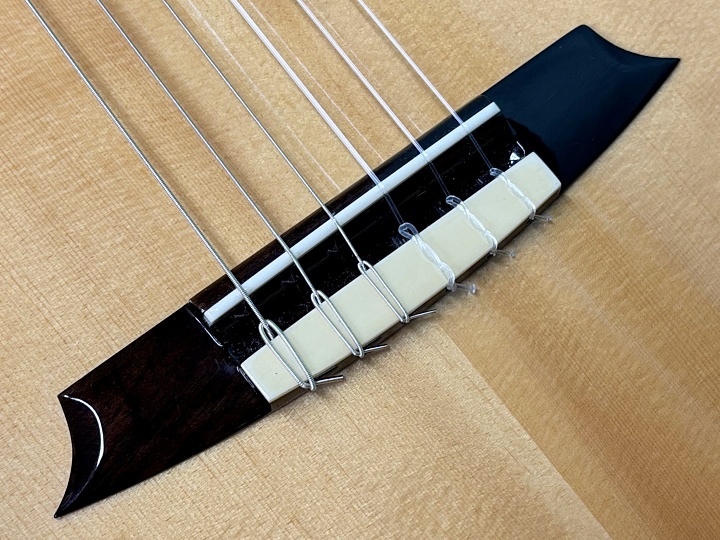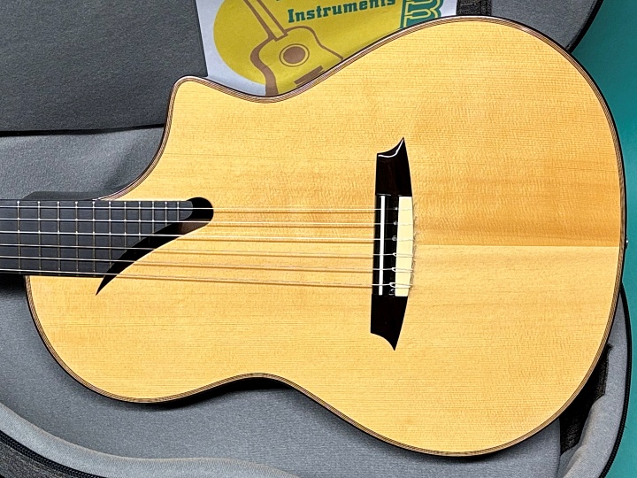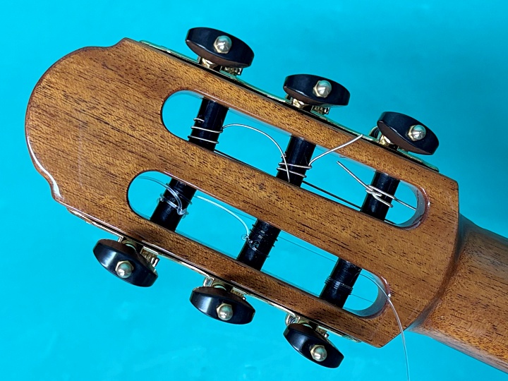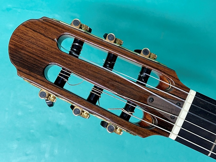 ボディトップはスプルース、サイド&バックはローズウッド合板、ネックはマホガニー、指板・ブリッジはエボニーです。ナット幅は48mm、スケールは650mm、14フレットジョイント、24フレット仕様です。ボディ厚が薄く抱え心地も良く、カッタウェイ仕様のためハイポジションでの演奏性にも優れています。また、ボディサイドにもサウンドホールが施されており、演奏者が音を把握しやすいようにモニター効果があります。ペグはオリジナルで、動作もスムーズです。