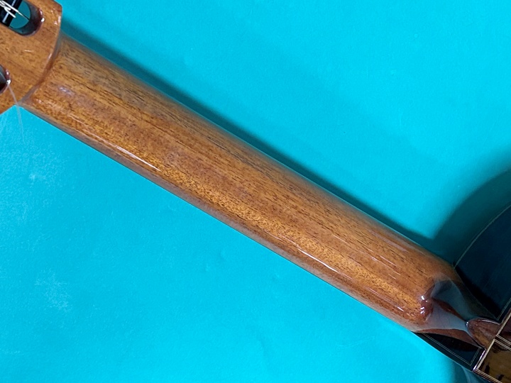 状態につきましては、ボディトップに演奏に伴うゴマ粒大のポツキズが多数あり、その他に引っかきキズも見られます。ボディバックにも衣服のボタンなどによると思われるスリキズが確認できます。ネック裏や板面は比較的綺麗な状態です。
