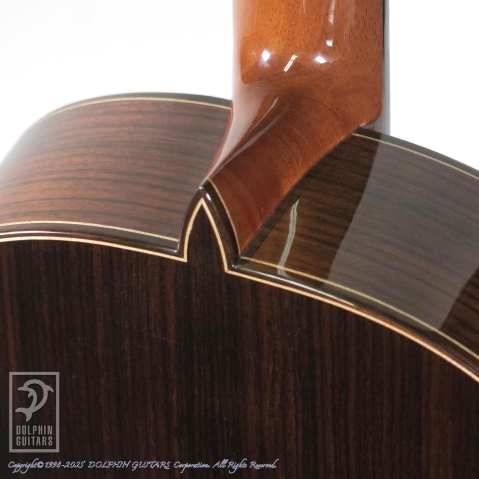 レイズドフィンガーボードとも呼ばれるこのデティールは、アメリカの製作家トーマスハンフリーがデザインし世に広めたと言われております。ジョイント部分が持ち上がるおかげでハイポジションの操作性が向上することや、弦がブリッジにかかる力の向きが変わる事で、よりダイナミックなサウンドが得られるのも大きな特徴です。