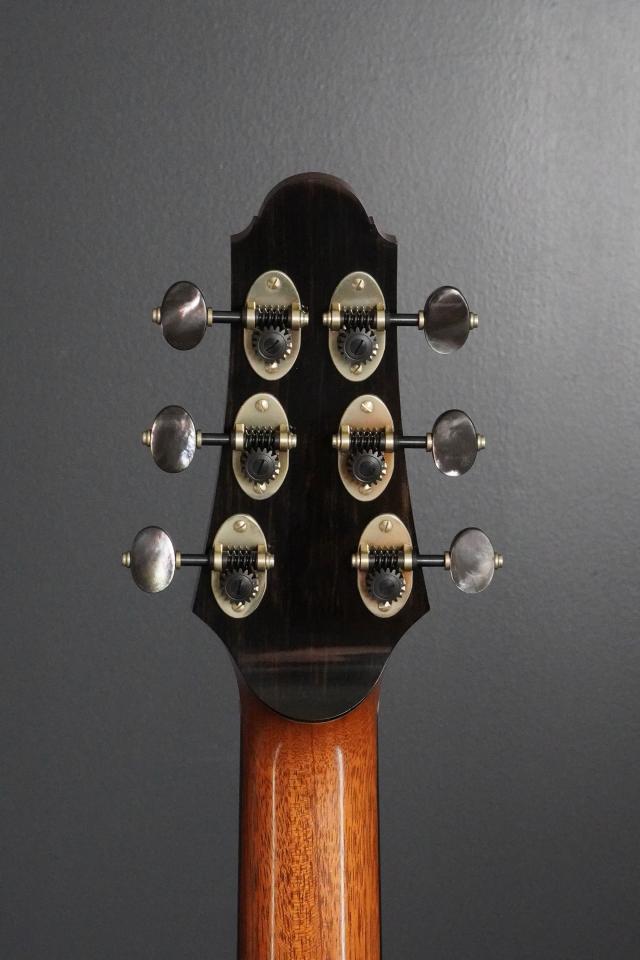 黒蝶貝のペグボタンも、シックなこのモデルに彩りを加え、実に魅惑的です。