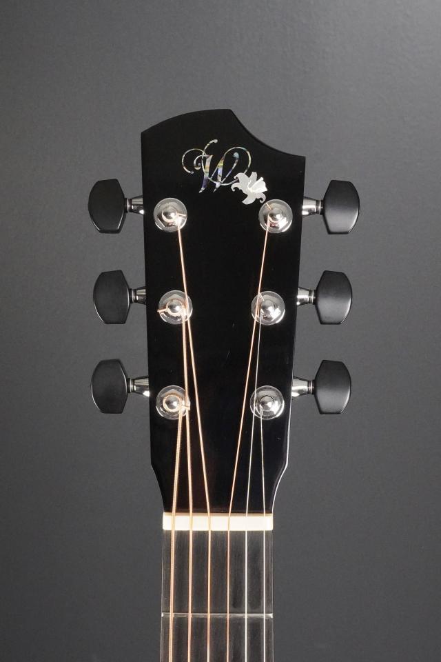 ヘッドの上には青みが強く、様々な色に輝いているアバロン貝のWロゴにパールを使った花のインレイ。