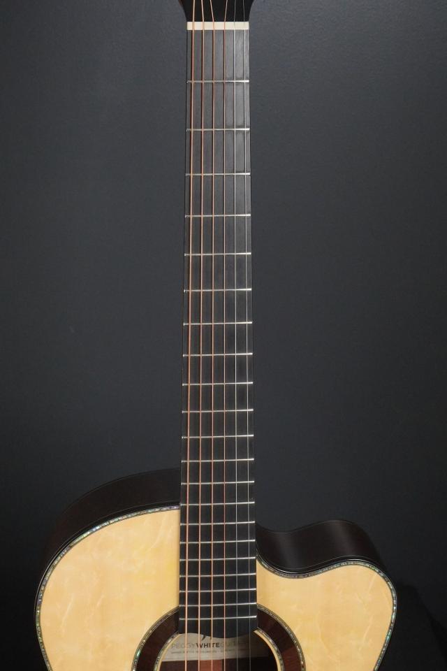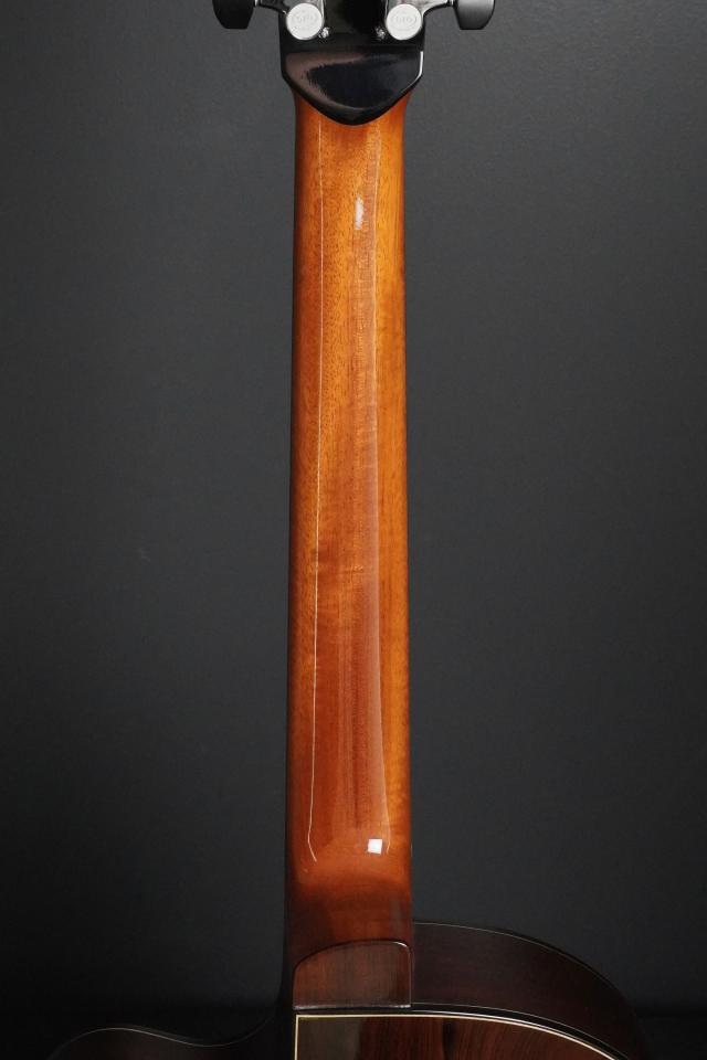 ナット幅は44.5mmで、ローポジションからハイポジションまで厚みの変わらない少し平たいネックシェイプです。スケールは650mmで、リンダ・マンザーのギターと同じスケールですので、オープンチューニングにも対応できるギターです。