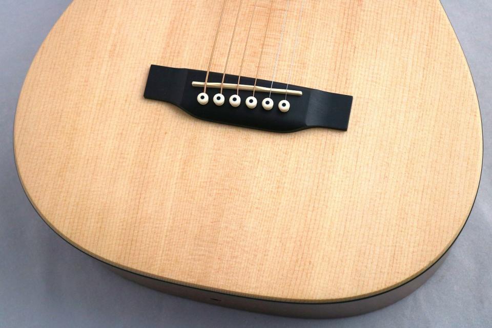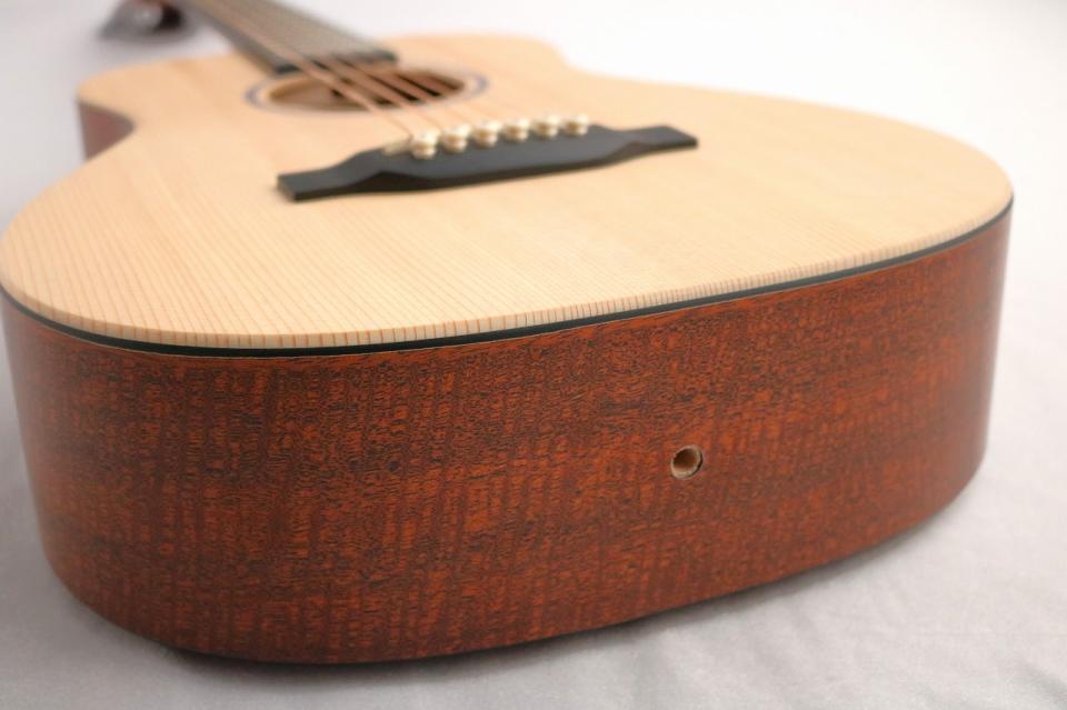 また、当モデルはボディトップにはアコースティックギターでは定番木材であるスプルースを使用しているため、小さなサイズというのを感じさせない十分な音量と木材の温かみを感じるアコースティックサウンドを備えております。