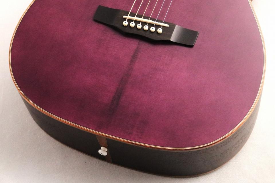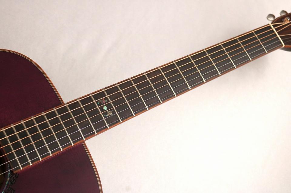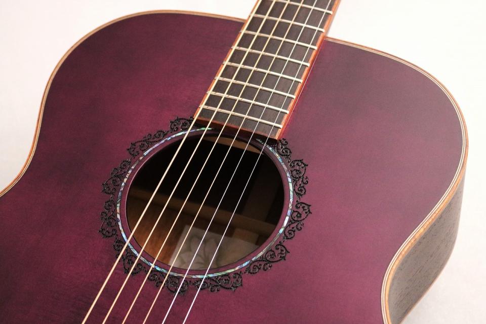 また、サウンドホールのロゼッタ部にはレーザーによる細かな装飾や指板のワンポイントのインレイなど、美しいカラーリングを邪魔しないさりげないデザインもまたモデルの魅力を一層引き上げております!