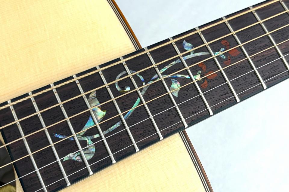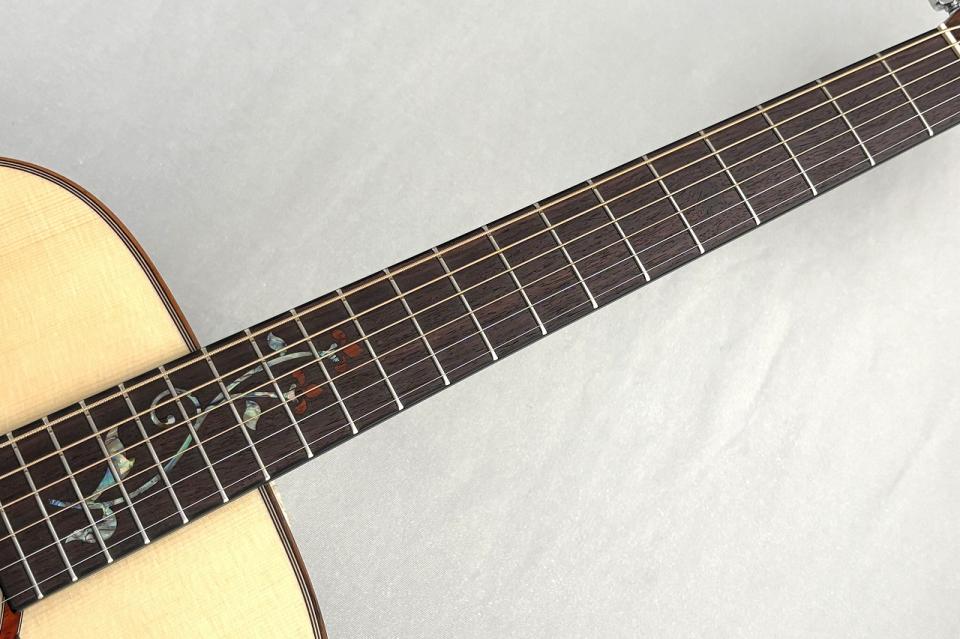 指板のハイフレットを彩るインレイはリンドウの花をモチーフとした美しいインレイ。