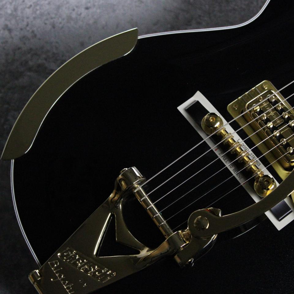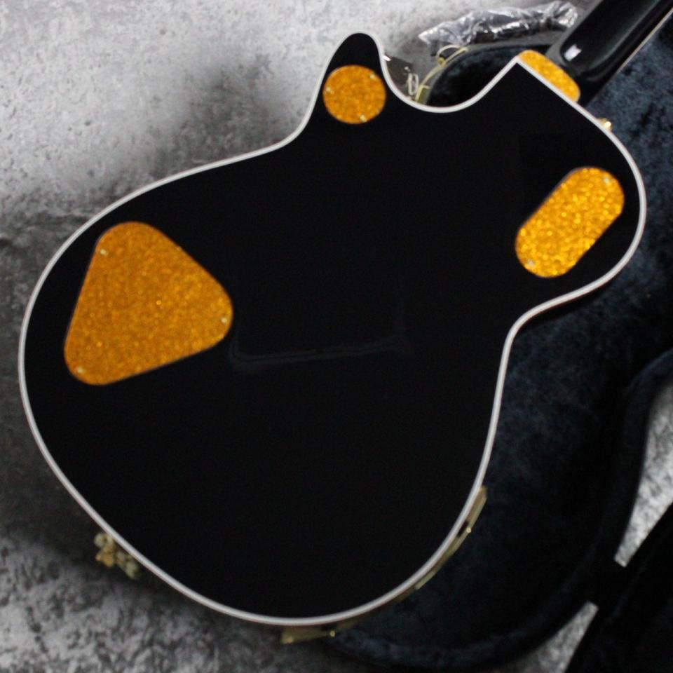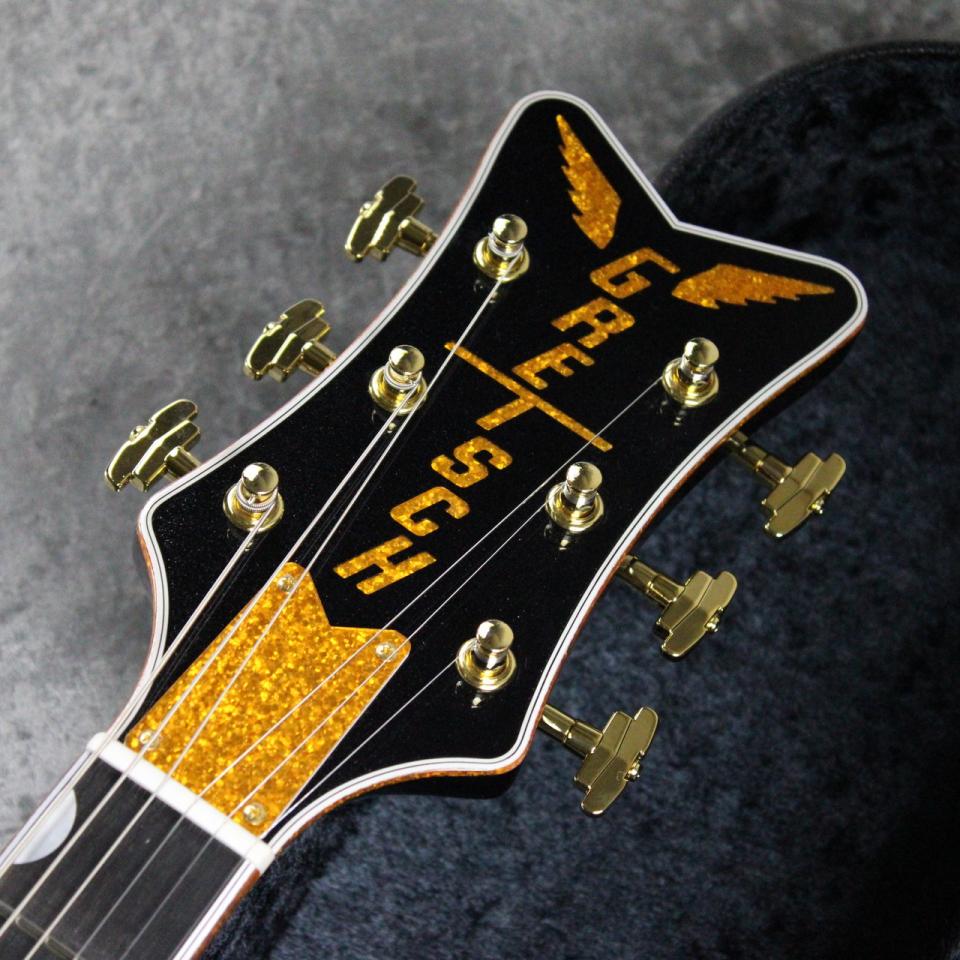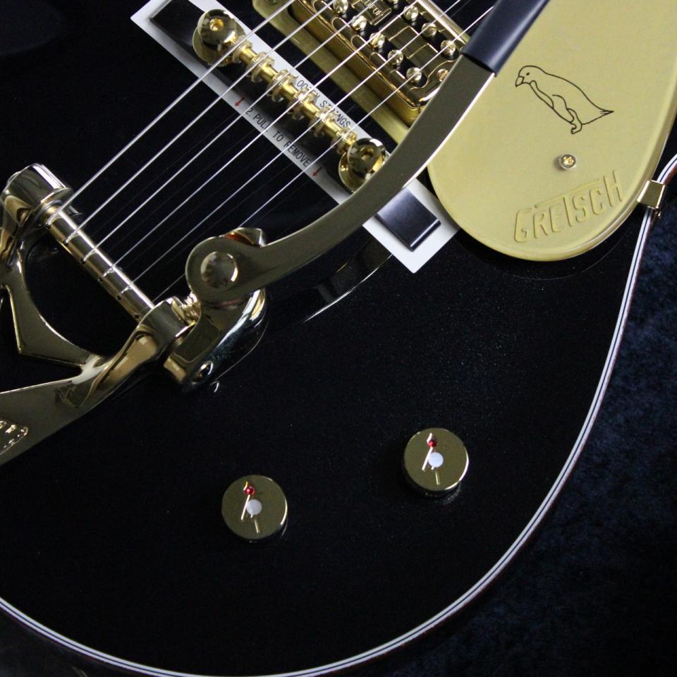 ピュアなトーンと快適な弾き心地を追求し、クラシックとモダンな仕様を融合。ジュエルドG-Arrowノブ、マルチプライのパーフリング付きゴールドスパークルバインディング、パーロイドNeo-Classicサムネイルインレイ、蓄光式Luminlayサイドドット、ゴースト処理されたGretschロゴとPenguinグラフィックをあしらった厚みのあるゴールドヴィンテージプレキシピックガード、Bigsby B3GPストリングスルーヴィブラート、ピン留め式エボニーべース付きSpace Controlブリッジ、ボーンナット、Grover Imperialチューナーなどの特徴を備えています。