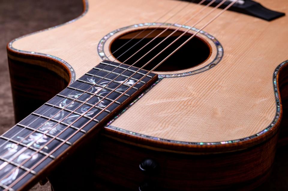 サウンドは、Taylorらしいクリアでブライトな基音に、ココボロ特有の艶やかな倍音、そしてベアクロースプルースのエアー感が絶妙に融合。