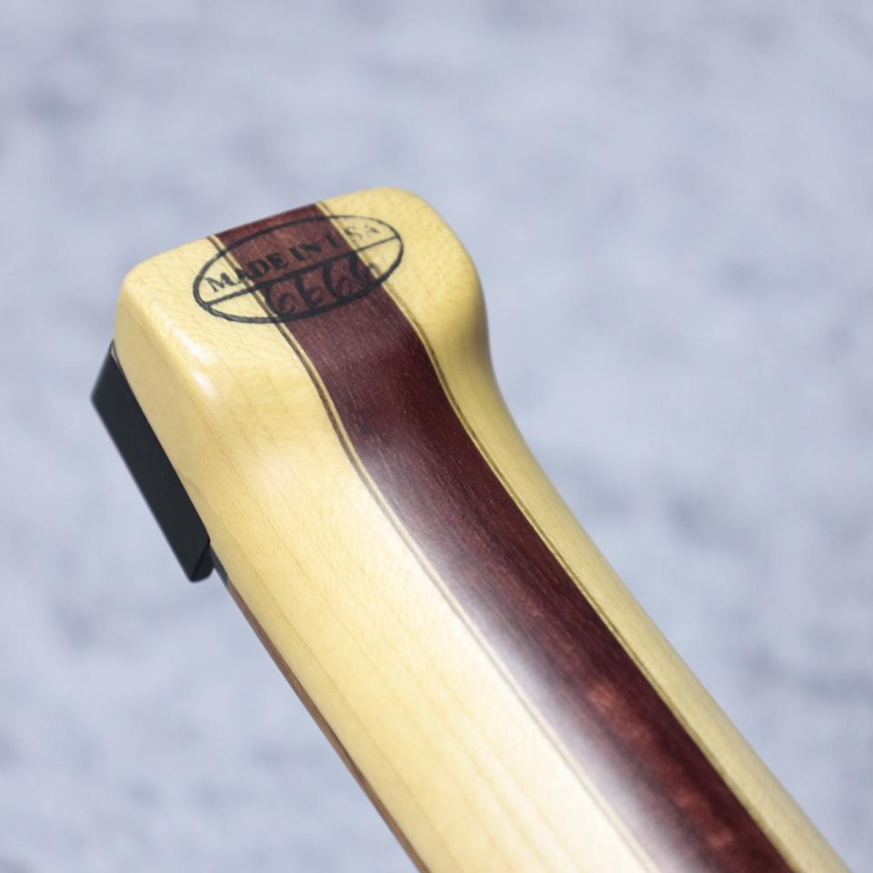 キルトメイプルトップ/スワンプアッシュバックのボディ構造に、パープルハートとメイプルのラミネイトネック、ボリビアンローズウッドを採用した木材構成。