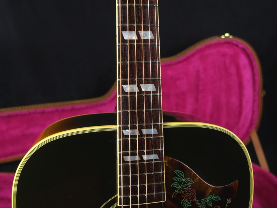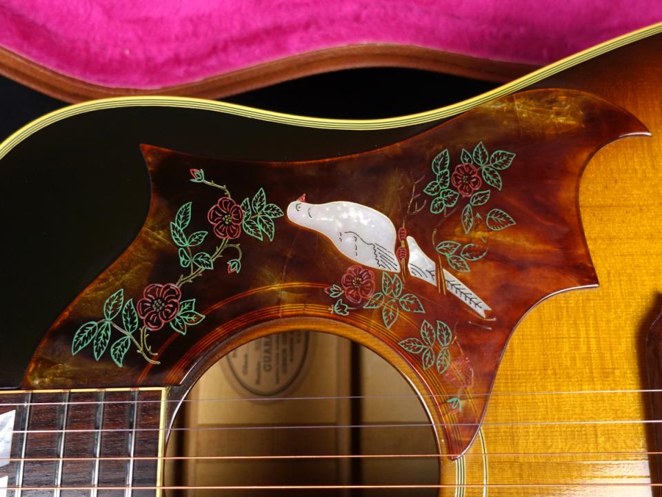 このモデル最大の特徴でもある“Dove(鳩)”をモチーフとしたピックガード、ダブル・パラレログラム・インレイ、ひと手間掛ったブリッジなどが高級感を感じさせます。