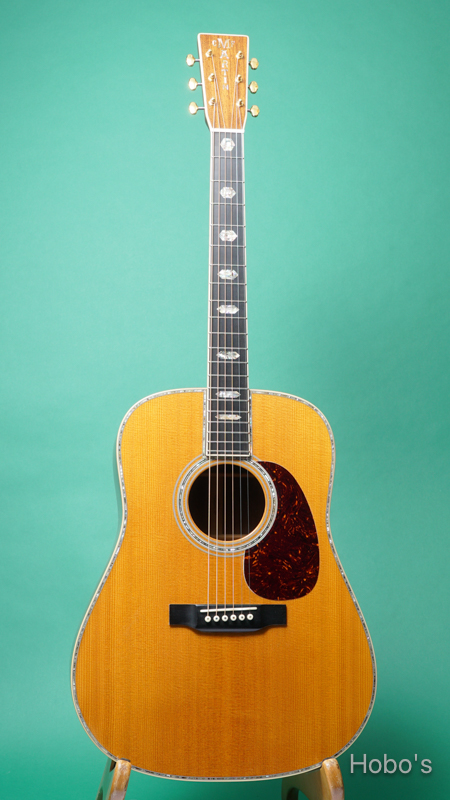 本ギターはレギュラーモデルにおけるマーティン社の最高級モデルで、コンディション良好な名品です。表板にシトカスプルース、側裏板にはインディアンローズウッド、ネックにも貴重なマホガニーが使用されており、共にマーティン社により厳選された最高級材が施されている点が特徴ですが、ブレーシングもゴールデンエラと同じく、フォワードシフテッド・スキャロップドX仕様へ、そしてナット幅も44.5mm仕様に変更になったことが、最大の特徴と言えるでしょう。その他ネック形状が、Modified Low Oval Profileのパフォーマンステイパーになっており、様々なプレイヤーが持ち替えやすく幅広い演奏性が期待できる形状となっております。従来のタイトな中低音と澄んだ高音はそのままに、より基音が太くなりパワー感が増しながらもレスポンスも良く、豊かな倍音はまさに格別。他メーカには決して真似出来ない門外不出のきらびやかなサウンドは、深みと艶のある出音に仕上がっております。従来のレギュラーモデルと比較しても少しの力で広がりのある出音が体感して頂くことが可能で、演奏性とサウンド面において伝統を重んじながらも、新しいマーティンの魅力が溢れているまさに現在の名器。秀逸D-45として昇華した最高級マーティンサウンドの魅力を存分にご堪能して頂けることでしょう。