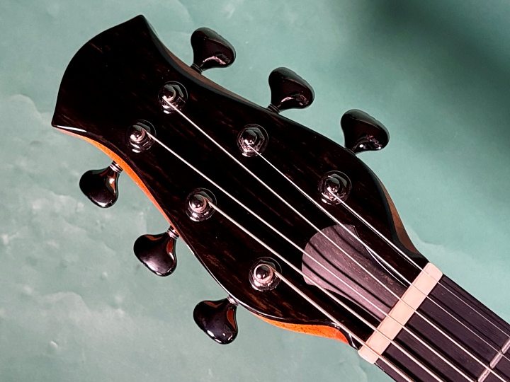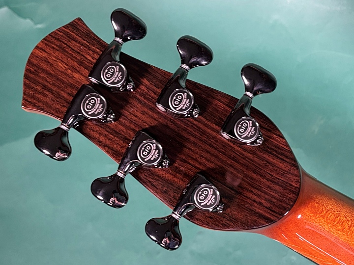 ボディとネック裏は艶ありのグロスフィニッシュ仕上げ。ペグにはGOTOH製510を搭載しており、動作もスムーズで安定しています。ナットとサドルにはボーン素材を採用。標準でネックヒールにストラップピンが取り付けられています。