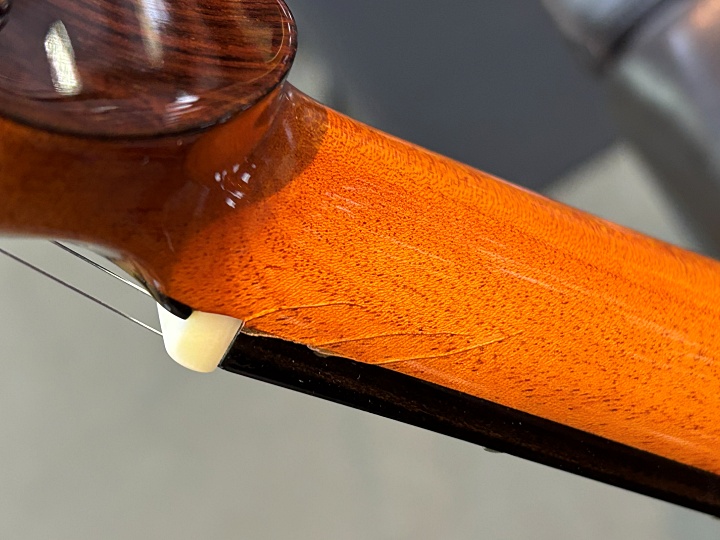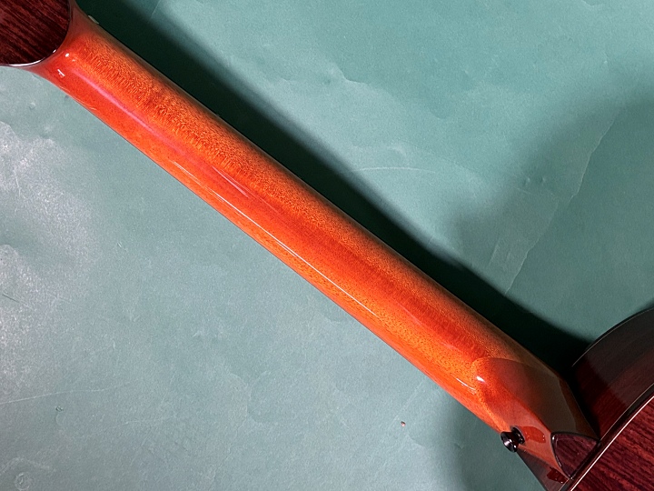 状態については、展示会などでの試奏品だったようで、B級品扱いとなっています。ぱっと見は綺麗ですが、光にかざすと軽微なスリキズが確認できます。また、ネック裏の1フレット両サイドに塗装のウェザーチェックが数か所入っており、目立ちますが修理の必要はありません。さらに、シリアルナンバーがなく、プロト品のようです。