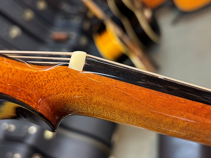 当店入荷後、各部調整済み。12フレットでの弦高は、6弦:2.5mm、1弦:1.8mmです。トラスロッドに問題はなく、フレットの凹みも見られません。サドルにも十分な余裕があり、当面はメンテナンスフリーでご使用いただけます。