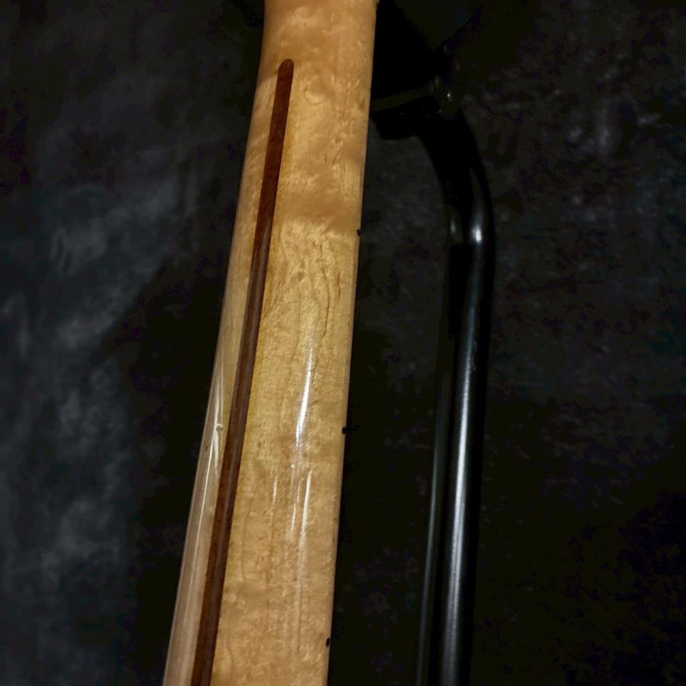 本機はFST-60または65と思われる仕様で、最大の特徴はボディ・ネック・指板までメイプルで統一されたフルメイプル構成です。見た目のインパクトはもちろん、音にも明確な個性があり、一般的なアルダーやアッシュ系ストラトとは異なる力強さと密度感を備えています。