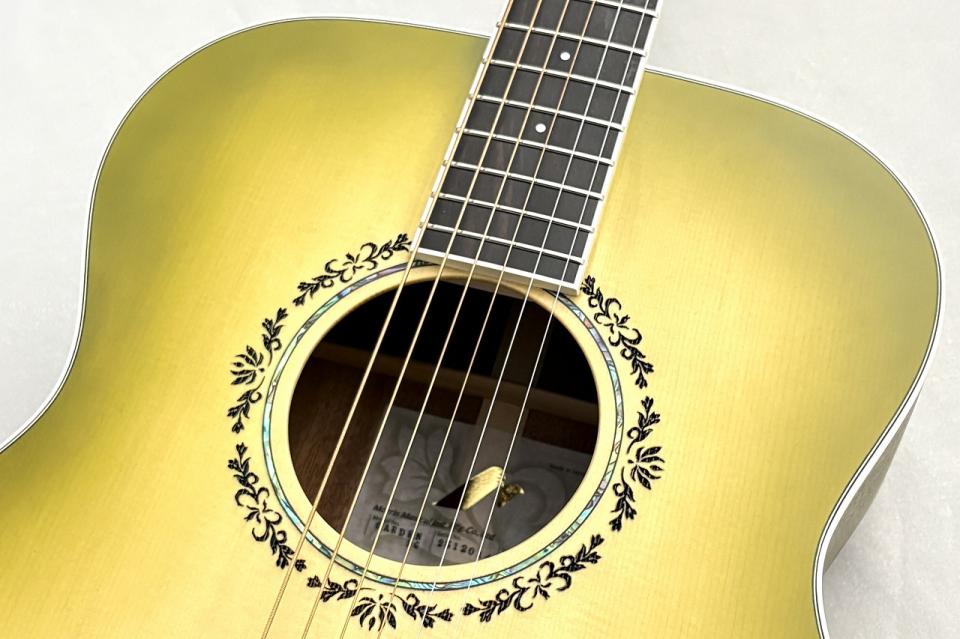 サウンドホールのロゼッタ部にはレーザーによる細やかながらもシンプルな装飾は美しいカラーリングを邪魔しないさりげないデザインとなっており、モデルの魅力を一層引き上げております!