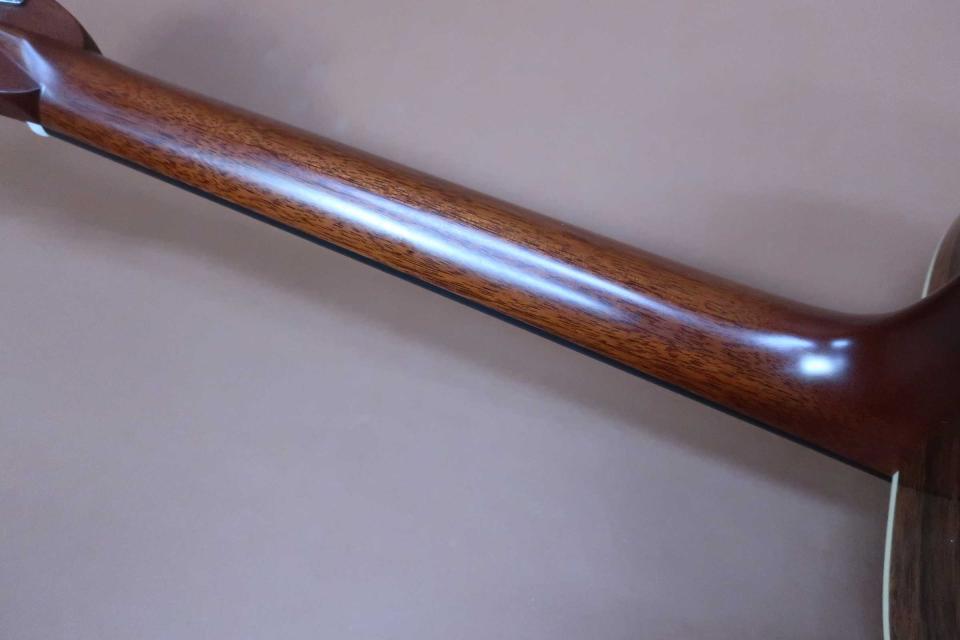 サウンドはトップ構造が百瀬氏のオリジナルであるリアシフテッド・ノンスキャロップド・Xブレイシングが採用され、野太く締りの有る低域の箱鳴りと、パワフルでコシの有る輪郭の際立った音抜けの良い中域はしっかりとしたレンジ感もあり、ノンスキャロップの骨太な響きと、ジャーマントップとマダガスカルの煌びやかで倍音豊かな艶のある高音域も魅力です。弾き込むほどに深化を見せる高いポテンシャルを秘めた傑作です。