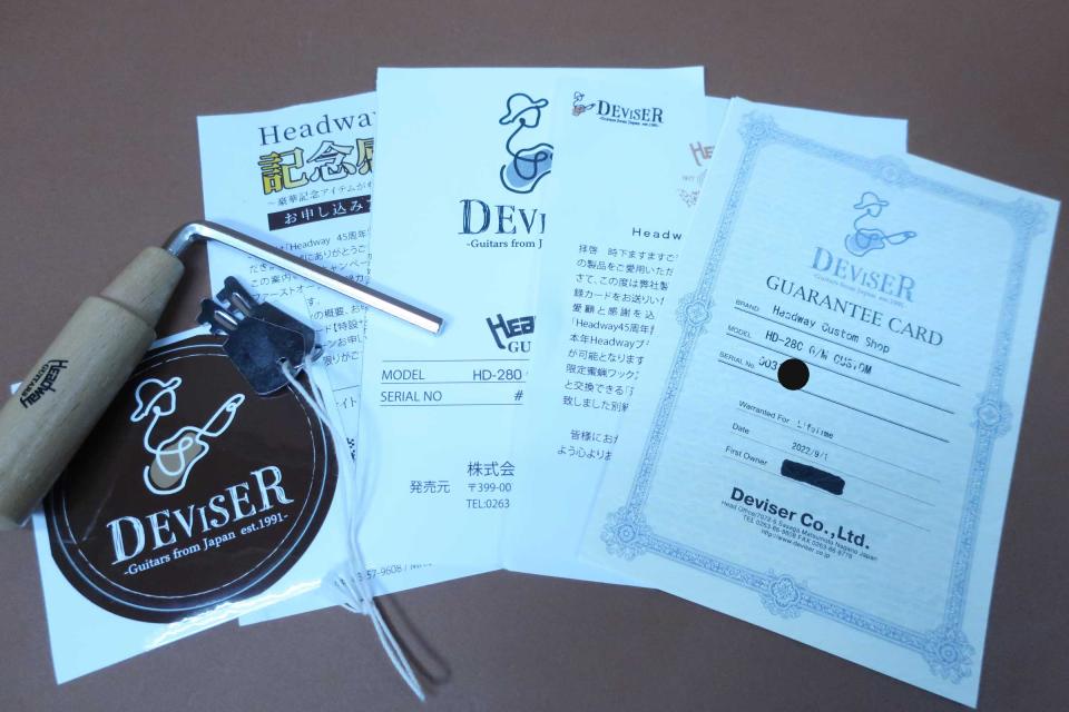 『信州の名工』百瀬恭夫氏によるカスタムショップ製、Headway HD-280 G/M Customの入荷です。本器は名工 百瀬恭夫氏製作によるカスタム・モデルで、トップには均一な木目のプレミアム・ジャーマン・スプルース単板、サイド&バックには濃淡の美しい厳選されたマダガスカル・ローズウッド単板、ホンジュラス・マホガニーネック、エボニー指板&ブリッジ、ロングサドル、ペグはオリジナル・グローバー製102C、スロテッド・ダイヤモンド・アバロン・ポジションマーク、塗り込みべっ甲柄セルロイド・ピックガード、ヘリーンボーン・トリム、アイボロイド・バインディング、本ギターはアジャスタブル・ネック調整用トラスロッドがサウンドホール側で6角レンチで調整が可能です。また表板の裏には百瀬氏がセレクトした日付とサインが確認できます。