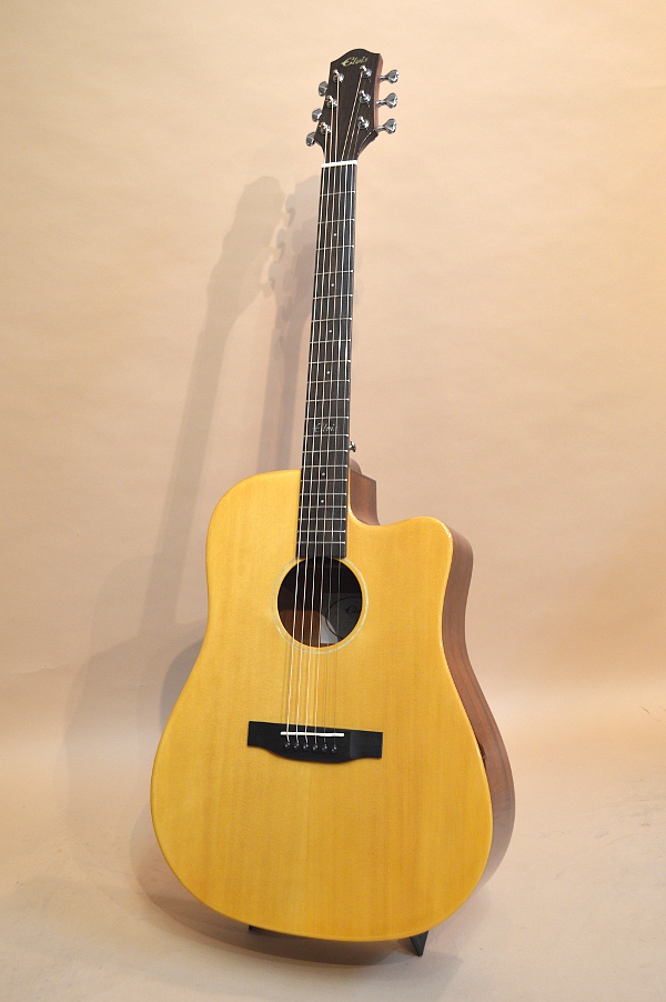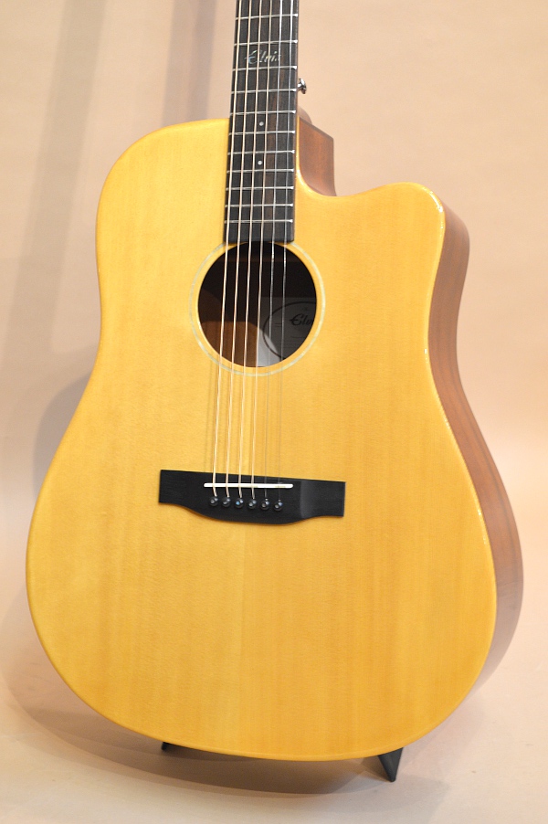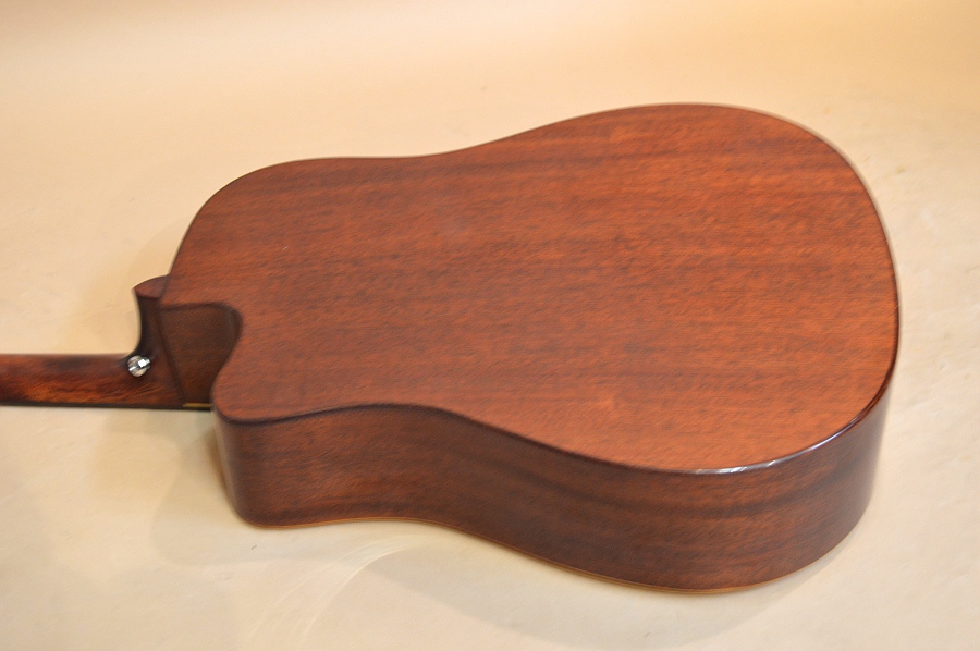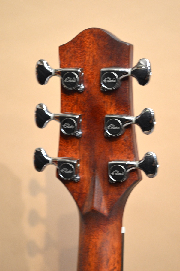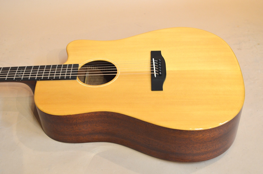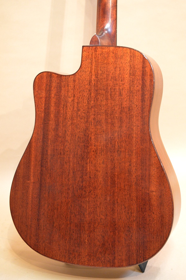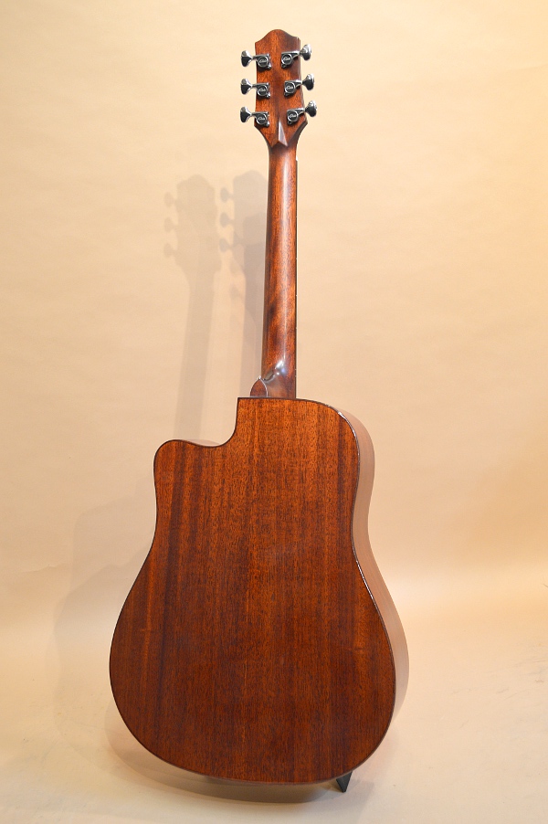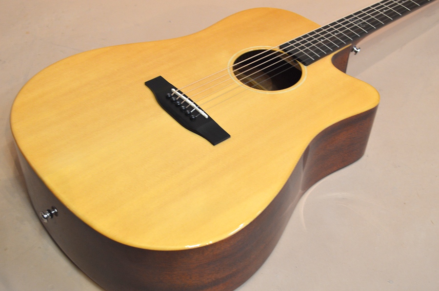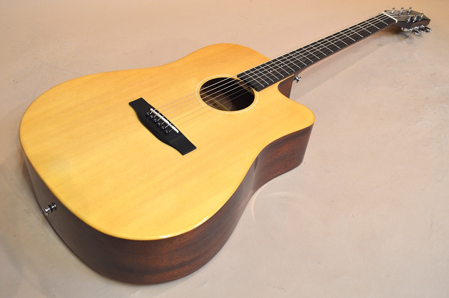 ソリッド・スプルースTOP、ラミネイト・マホガニーSIDE&BACK、マホガニー系NECK、ローズウッド指板&ブリッジ、スキャロップ・ブレーシング、実測43mmナット、25.5インチ・スケールのドレッドノート・カッタウェイ・ボディー。ボディー・エッジはラウンド・エッジ加工されていて、弾き心地もなかなか良いです。ペグもゴトーの510シリーズのような滑らかな曲線のペグが採用されていて、ギア比も18:1らしいです。エントリー・モデルにしては随分と豪華で品のある仕上がりになっています!