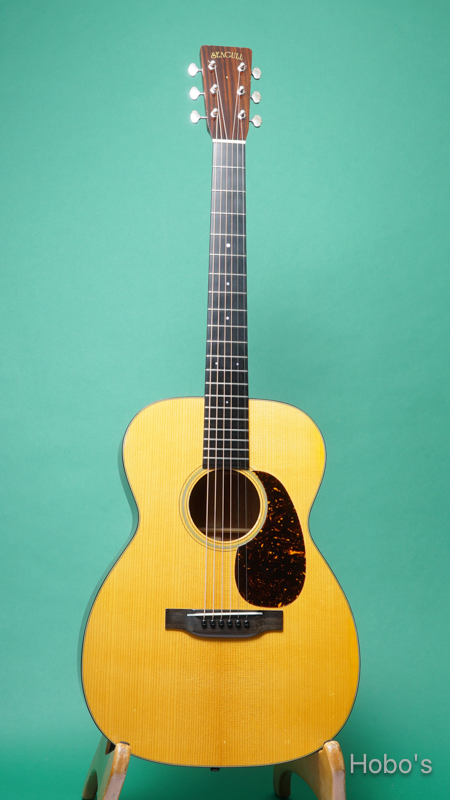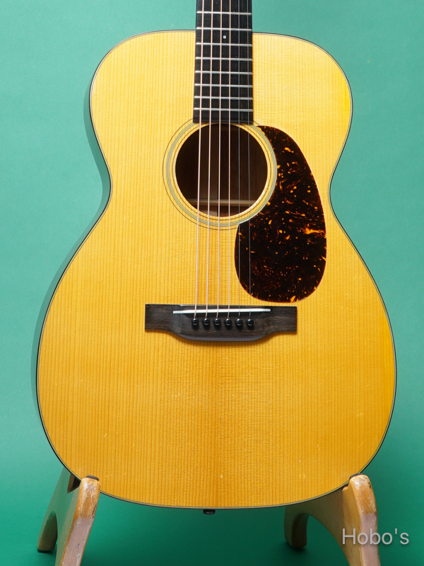本ギターは小型ギターの定番00-18スタイルモデルで、戦前マーティンを追求し、手工製作されたこだわりの逸品です。表板とブレーシングには、トリファイド加工が施されたアディロンダックスプルース、側裏板及びネックには貴重なマホガニー、その他セルロイド流し込みべっ甲柄ピックガード、並びにロングサドル仕様やオープンバックペグ、及びスキャロップドXブレイシングなど、サウンド面と外観共に、細部に渡り戦前スタイルを見事再現致しております。ヴィンテージを追求したこだわりの材や、外観スペックは勿論のこと、サウンドメイキングにおいて重要であるトップとバックのブレイシングの加工作業は、塩崎氏自らが手がけたもの。綿密な音作りがなされているこだわりも特筆すべき点と言えるでしょう。軽く爪弾いても音抜けよく前に出るサウンドは、ピック弾きでは湧き上がるように力強く、新しい楽器とは思えないレスポンス感と、響きの良さを体現しているまさに優れたギターです。また、本器最大の特徴でもある素晴らしいレリック加工は、塗装後にエイジド加工を行うのではなく、塗装行程を進めながら職人の手により、1本1本手作業で仕上げられているこだわりよう。エイジドのレベルは、A01からA03と3段階あり、本器は状態の良いヴィンテージギターの雰囲気という表現が合うA01仕様。弾きキズやウェザーチェックなど、経年の使用感はヴィンテージと見間違うほどのハイレベルな質感で、まさに絶妙の手技。とても完成度の高いギターです。新品でありながら乾いたレスポンスの良い出音はまさに一級品で、純国産の英知が詰まったオーセンティックサウンドの魅力を存分にご堪能して頂けることでしょう。