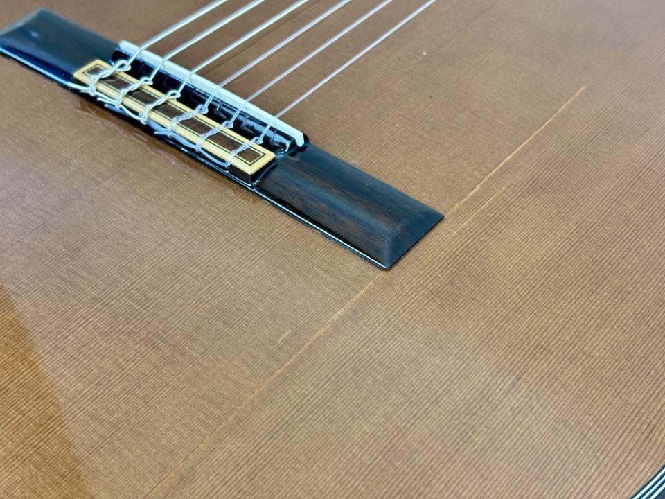 ブリッジの1弦側端に生じたトップの割れを補修したのち、ギター全体をラッカーで再塗装しております。