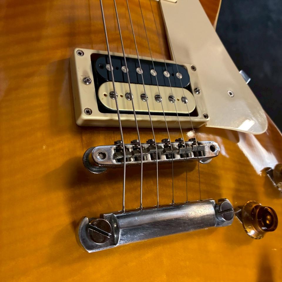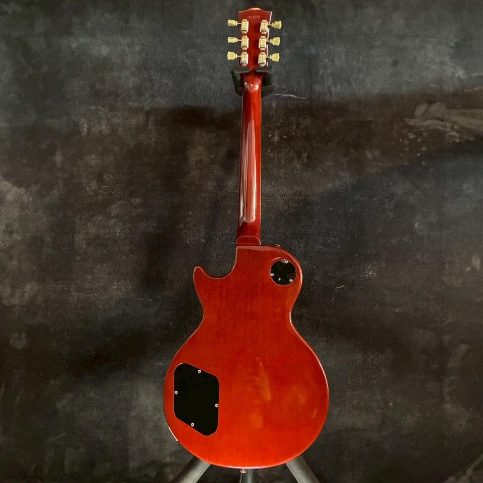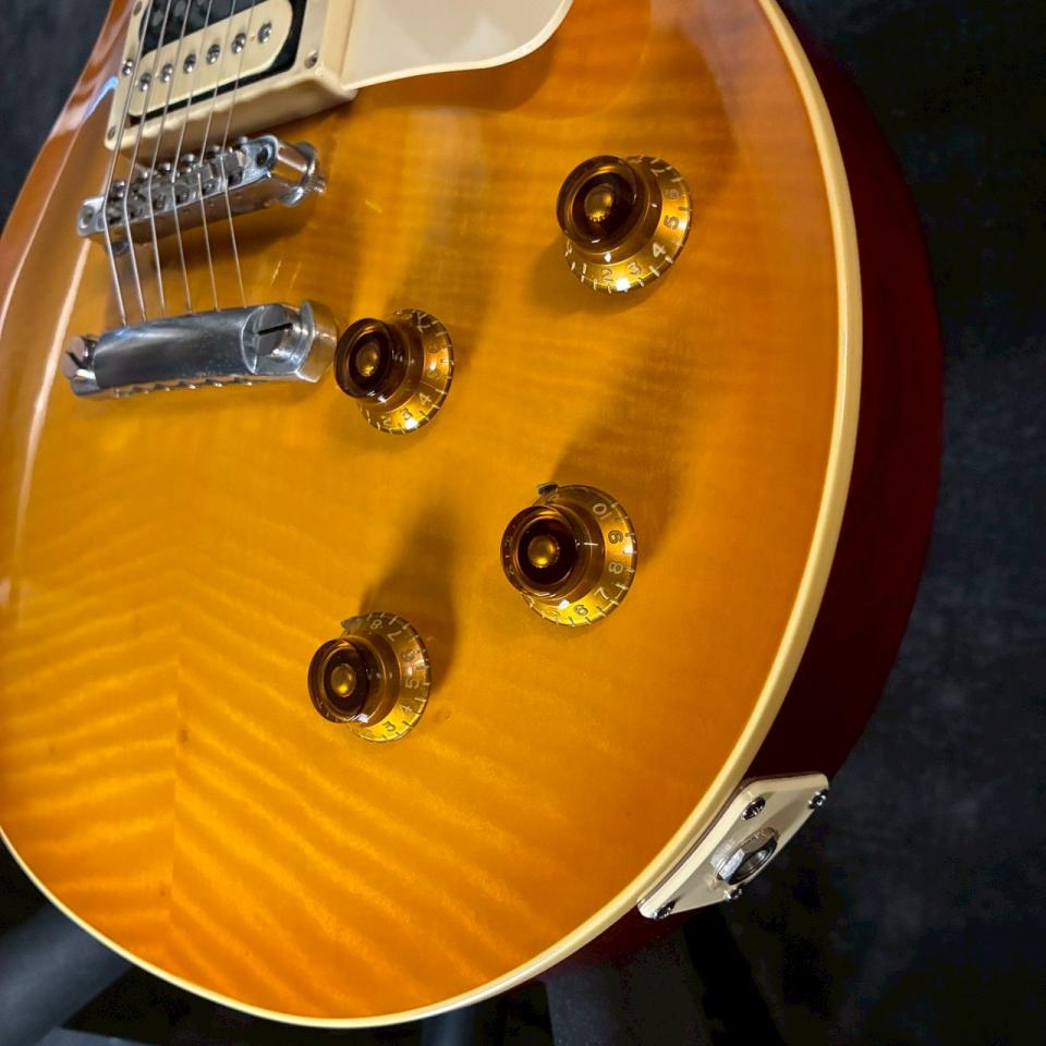 メイプルトップ+マホガニーバック、マホガニーネック、ローズウッド指板という王道の組み合わせにより、太さと粘りのある中域、豊かなサステイン、艶のある高域がバランス良く共存しています。クリーンでは甘く芯のあるトーン、ドライブ時にはレスポールらしい押し出しと厚みをしっかり感じられます。