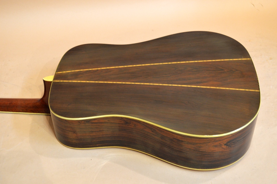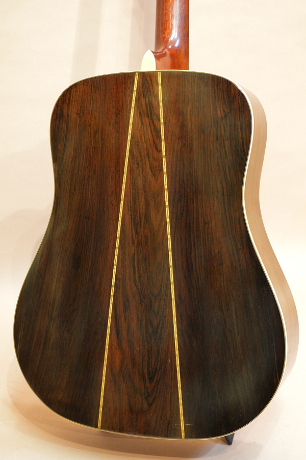 ソリッド・スプルースTOP、ラミネイト・ハカランダSIDE、ソリッド・ハカランダBACK、エボニー指板&ブリッジ、ロッド1フレット下、指板エンドにモデル名刻印有り、ネック・ブロックにシリアル印字、アバロン・ロゼッタ無し、実測43.7mmナット、645mmスケールのドレッドノート・ボディー。