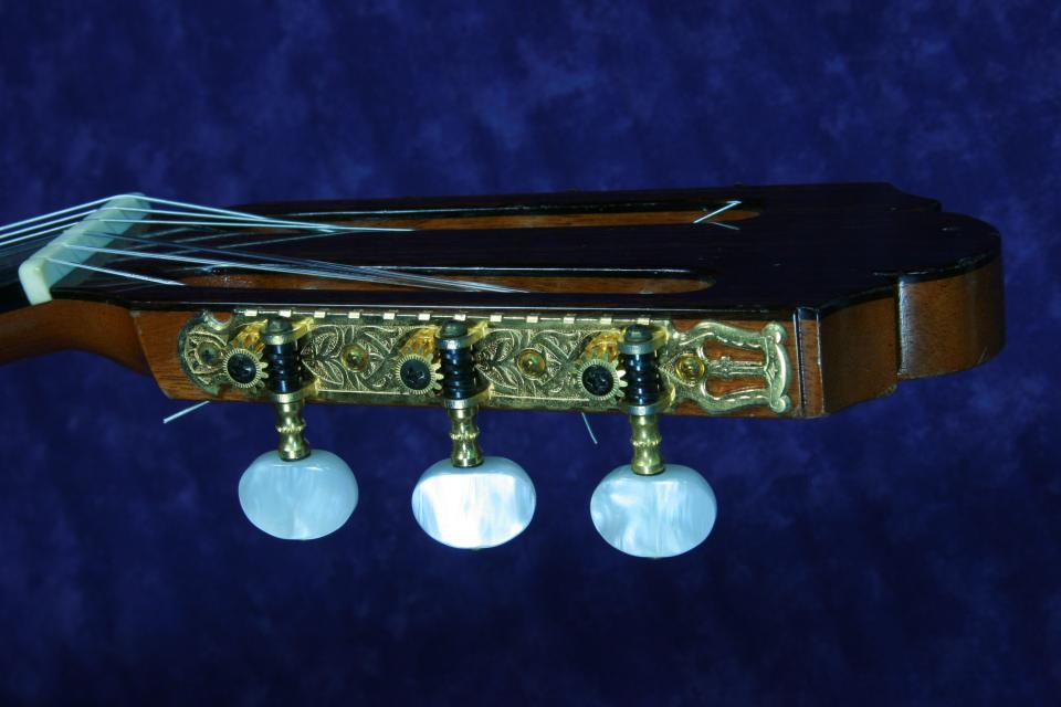 ブリッジとヘッドの飾り板はインディアンローズウッドです。