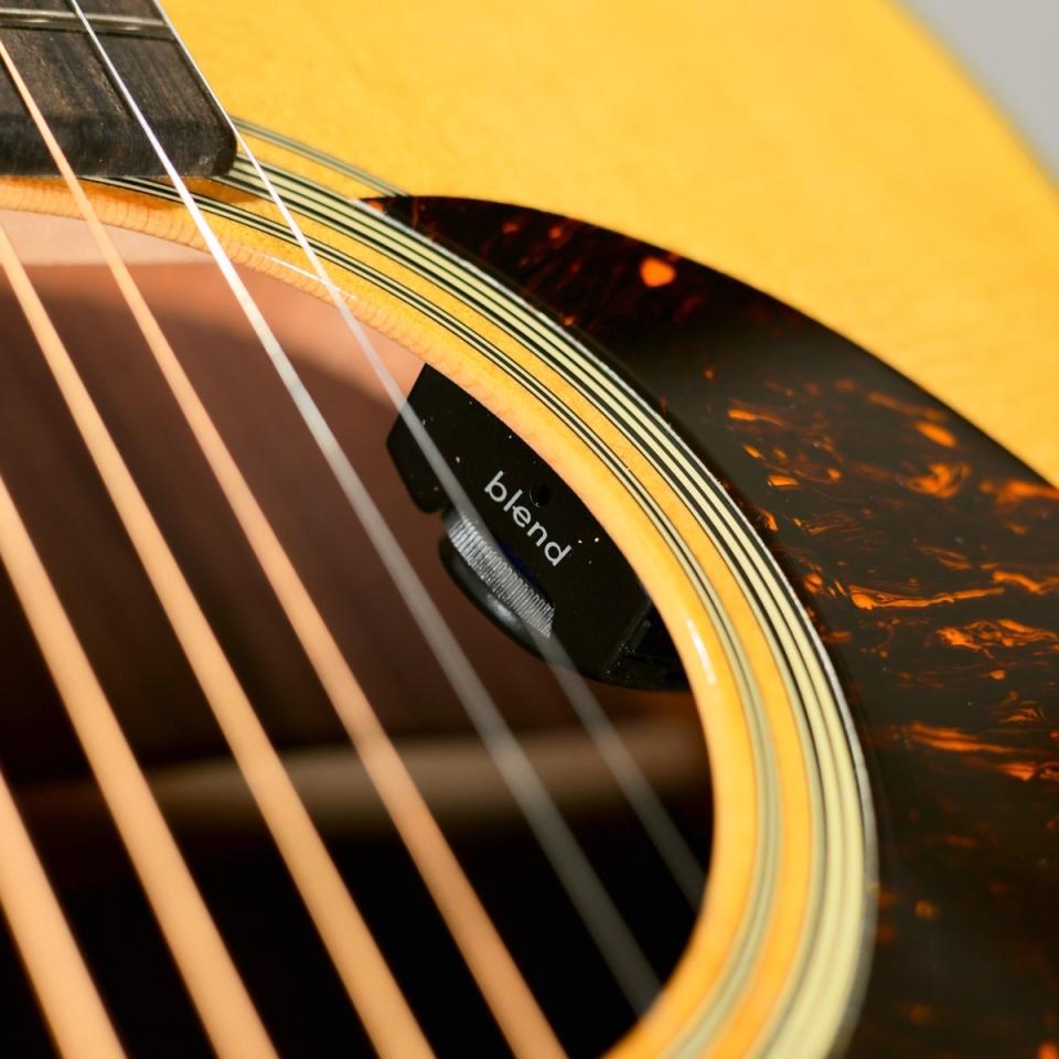 コントロールはサウンドホールに集約されており、ボリューム/トーンに加えてブレンドノブを搭載。アンダーサドルのアタック感と、マイクの空気感を直感的にミックスでき、プレイヤーのスタイルや現場に応じた音作りが可能です。