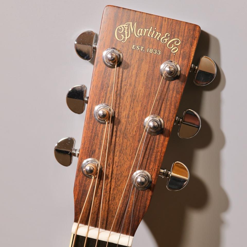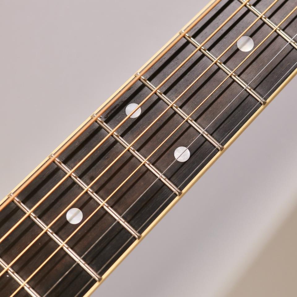 外観面では、アンティークホワイトのバインディング、マルチストライプのロゼッタおよびパーフリング、べっ甲柄ピックガードなど、ヴィンテージスタイルを色濃く反映。指板インレイにはStyle28パターンのマザー・オブ・パールを採用し、上品な装飾性も備えています。ヘッドプレートにはイーストインディアン・ローズウッドを用い、オールドスタイルのスクリプトロゴを配置。チューナーはクロームの密閉型ギアペグで、安定したチューニング性能を発揮します。
