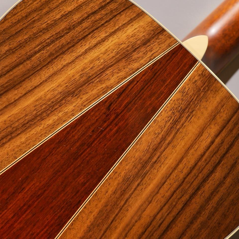ボディはD-14フレットジョイントのドレッドノートサイズ。内部構造にはフォワードシフテッドXブレイシングを採用し、ブレイスは1/4インチ幅のノンスキャロップド仕様。これにより、過度に暴れないタイトさを保ちながらも、しっかりとした音量とバランスの取れたレスポンスを実現しています。特に低音はD-28系とは異なる、よりしなやかで包み込むようなニュアンスを持ち、高音は繊細で抜けの良いキャラクター。ストロークでもフィンガースタイルでも扱いやすく、幅広いプレイヤーに適応する懐の深さが魅力です。