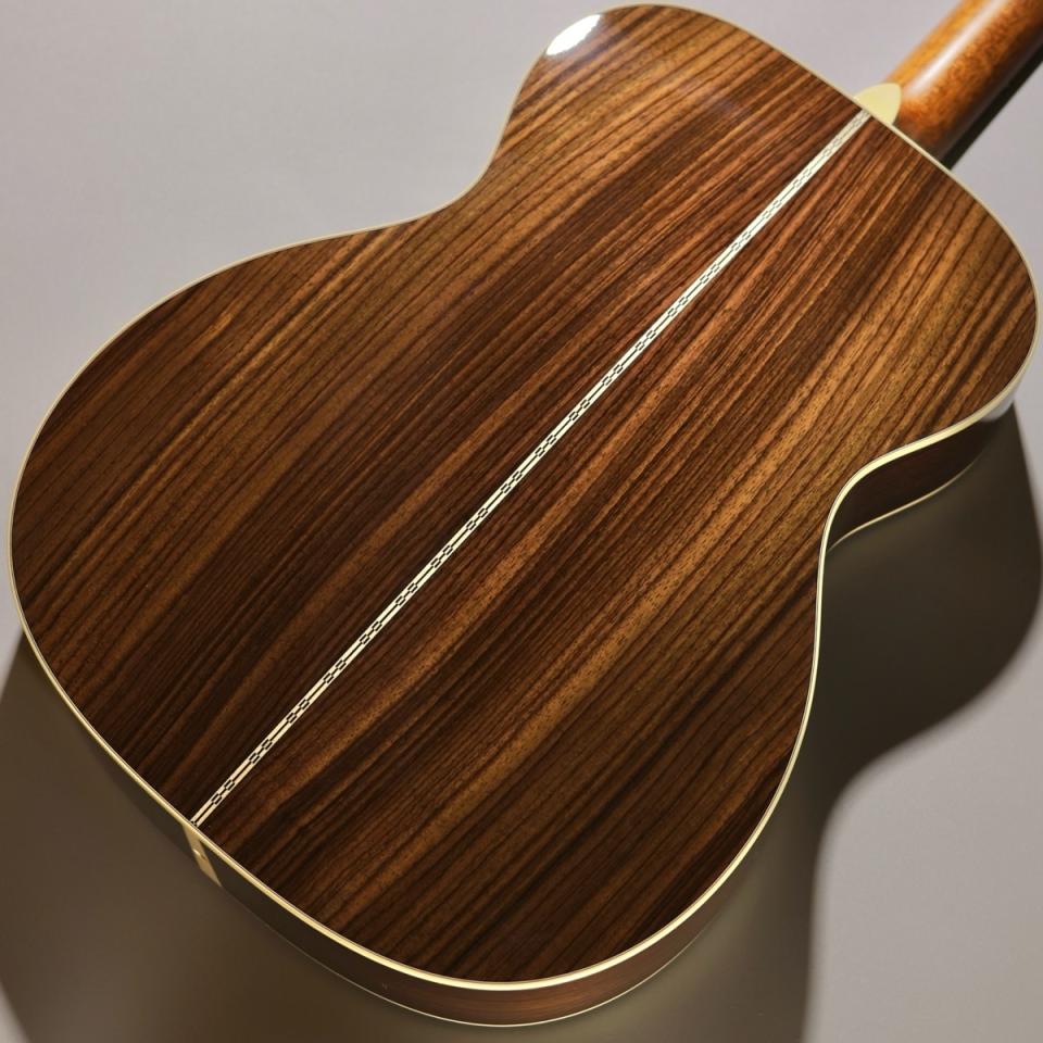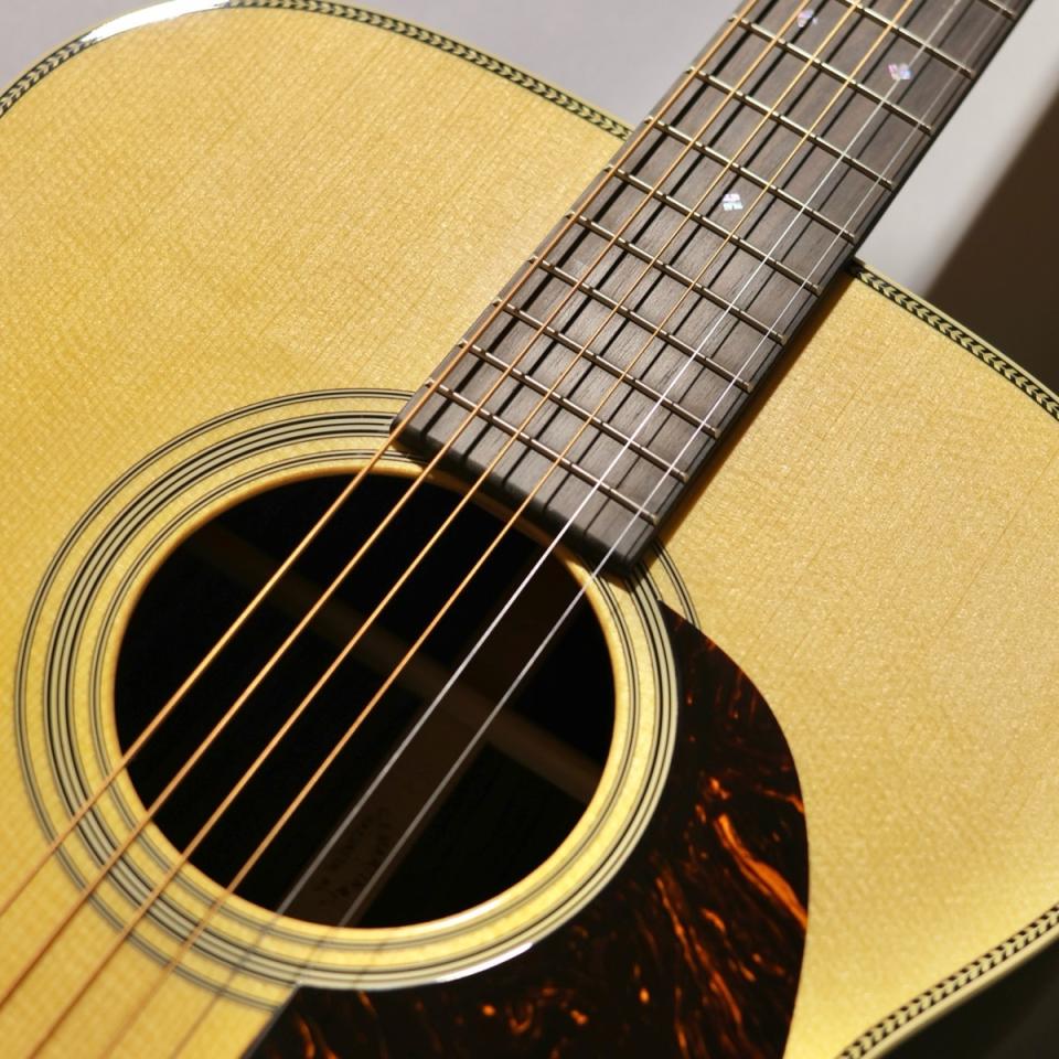 トップ材にはスプルースを採用し、サイドおよびバックにはイーストインディアン・ローズウッドを使用。これにより、クリアで伸びやかな高音域と、奥行きのある低音、そして豊かな倍音を伴う中域がバランスよく共存した、スタイル28らしいサウンドキャラクターを形成しています。ローズウッド特有の深い響きと、スプルーストップのレスポンスの速さが組み合わさることで、繊細なタッチから力強いストロークまで幅広いダイナミクスに対応します。