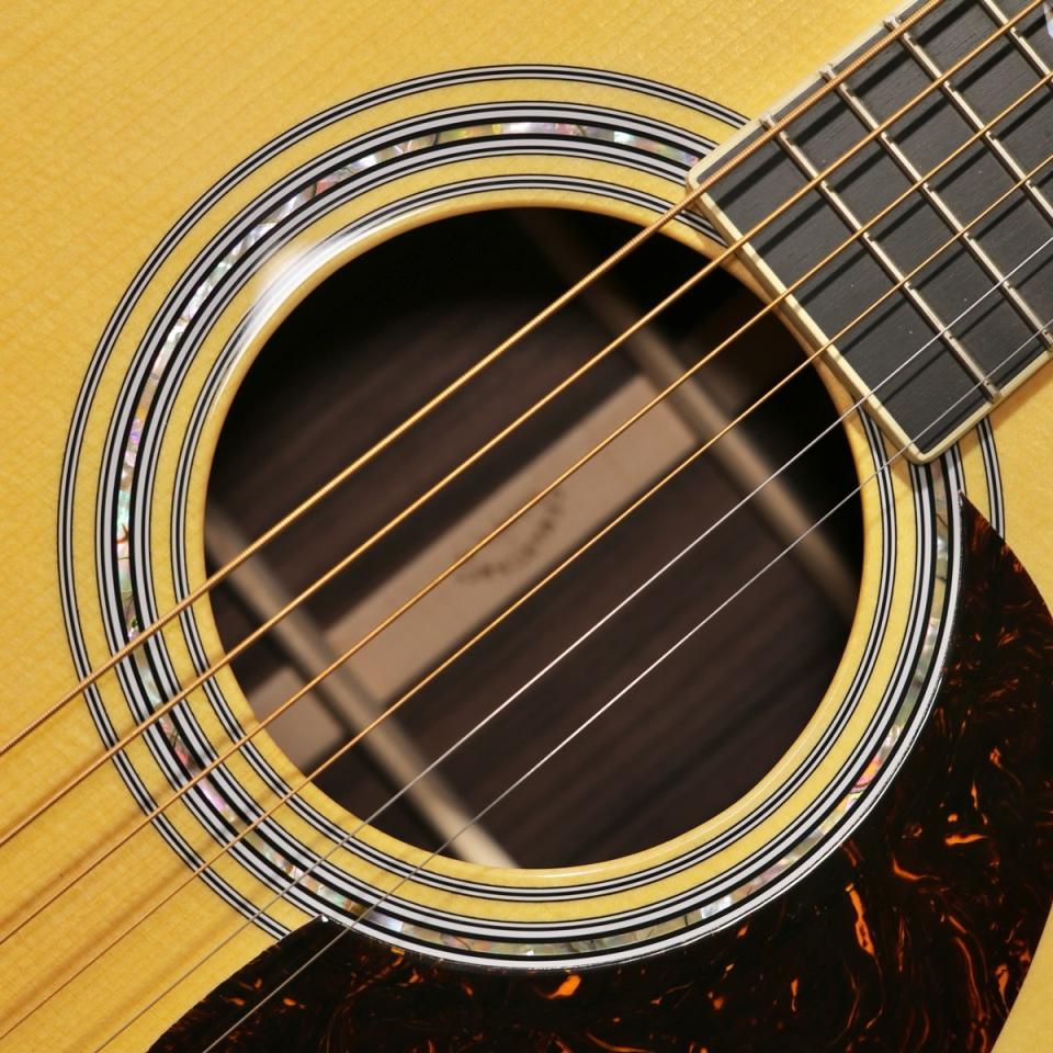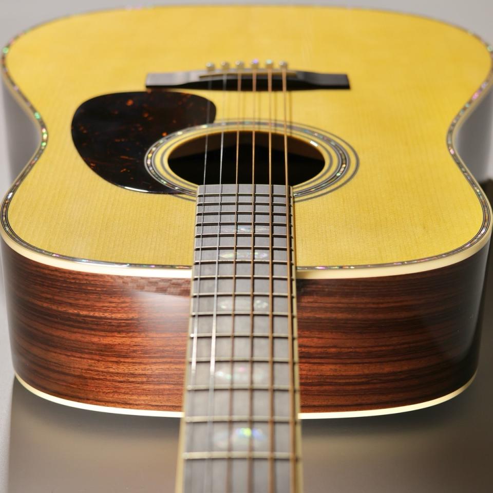 ボディには14フレットジョイントのドレッドノートサイズ(D-14 Fret)を採用し、トップにはスプルース単板、サイド&バックにはイーストインディアンローズウッド単板を使用。これにより、力強さと繊細さを兼ね備えたバランスの良い響きを実現しています。ブレーシングにはフォワードシフテッドのXブレイシングを採用し、さらにGEスキャロップド加工が施されることで、レスポンスの良さと豊かなサスティンを生み出しています。