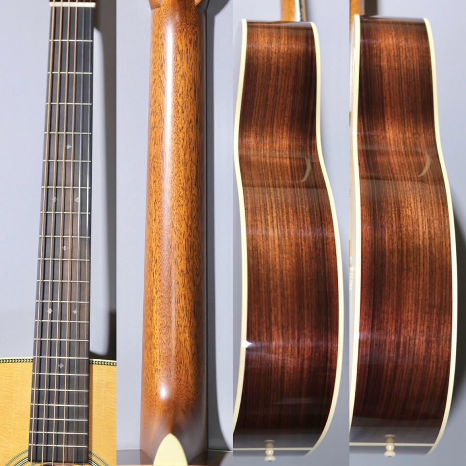 トップにはスプルース、サイド&バックにはイースト・インディアン・ローズウッドを採用しており、この伝統的な材の組み合わせによって、芯のある低音と華やかな倍音が共存する“28らしいサウンド”が形成されています。さらに、GE(ゴールデンエラ)スキャロップドブレーシングを採用することでトップの振動効率が高まり、レスポンスの速さと豊かな倍音、空気感のある鳴りを実現しています。単なるバランス型にとどまらず、弾き手のタッチに応じて表情を変える高い表現力を備えている点も大きな特徴です。