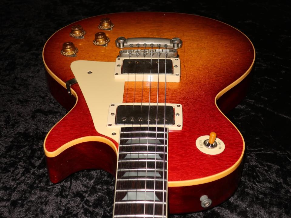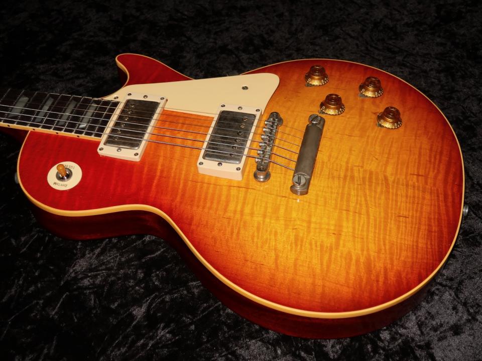 2025年10月 Gibson Brands Partner Experience Japan Dealer in Nashvilleにて現地選定材を使用した超リアル・フレイム。ネックシェイプは’59 LP “Cシェイプ”とフレットは’59 LPの"Medium Jumbo"、PUは今回オーダーに際して特別仕様の"Custombucker Alnico 2 Aged Cover“ アンポッテド“を搭載。キャビティ内のコントロール・ホットはヴィンテージのカーブを追及した500KΩポットにバンブルビー・コンデンサーもよりヴィンテージに近づけたものを搭載、指板とネックとボディーはハイドグルー(ニカワ)で接着されております。