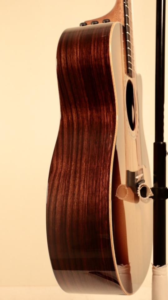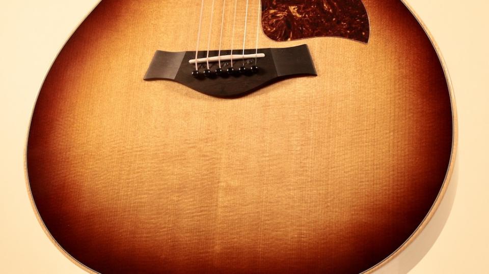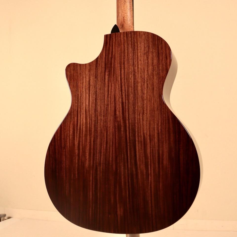 このモデルの心臓部には、テイラーが革新的な設計として開発した「V-Classブレーシング」が採用されています。従来のXブレーシングとは異なり、トップ板の振動を効率的にコントロールすることで、音量・サスティーン・ピッチの安定性を高い次元で両立。音の立ち上がりは非常にクリアで、コードを鳴らした際の分離感や和音の整い方にも優れています。フィンガースタイルでの繊細なニュアンス表現はもちろん、ストローク時にも音像が濁らず、プレイヤーのタッチやダイナミクスを素直に反映してくれる点が大きな魅力です。