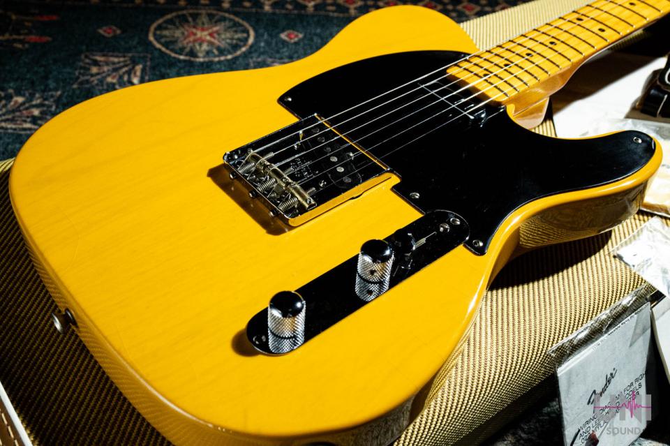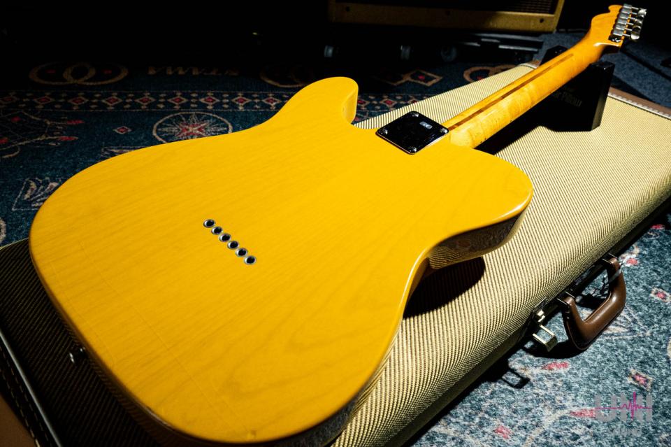 今回入荷した52テレキャスターはバタースコッチ・ブロンドにフィニッシュされたアッシュボディに、メイプル1Pネックといった、シンプルでトラディショナルなウッドマテリアル。