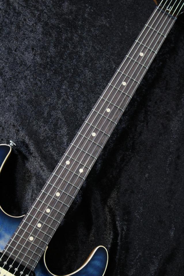 トップには、深くワイドにうねる上質なキルト材を採用。中心から外周へと自然にフェードするブルーバーストが、杢目の立体感をより明確に引き出しています。均整の取れた杢の出方、過度に派手にならない色味のバランスは、カスタムモデルならではの仕上がりです。
