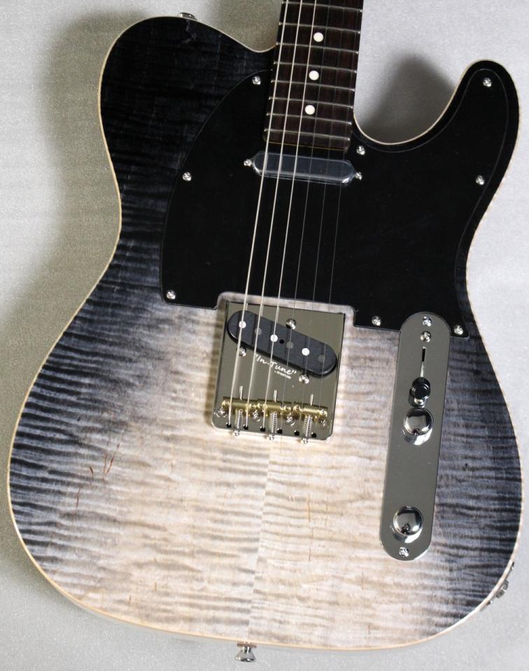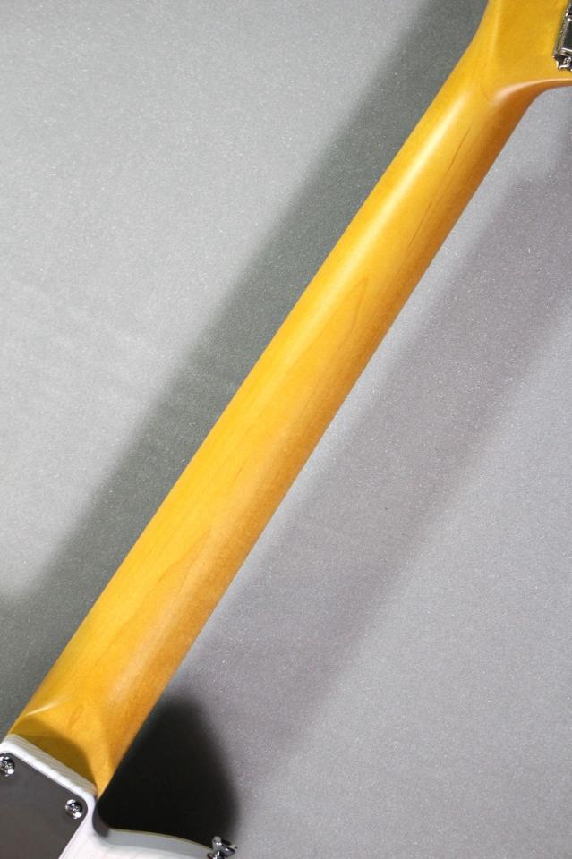 本個体のマテリアル構成はアッシュボディバック/フレイムメイプルトップ/メイプルネック/ローズウッド指板。