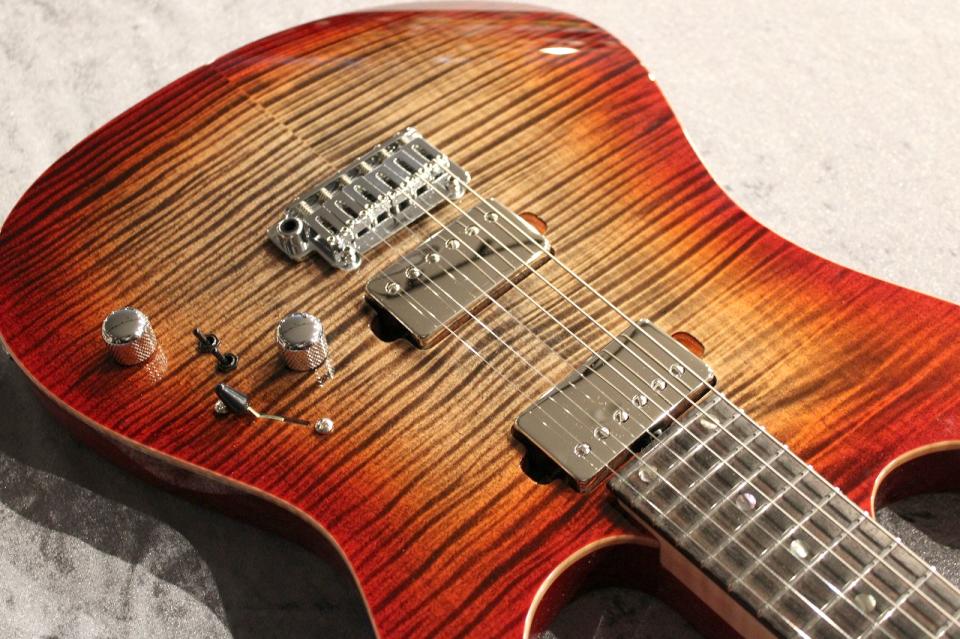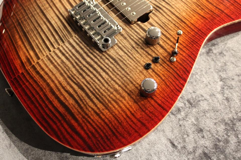 本機は、長野県塩尻市のRed House工房を当店担当が訪問した際、数ある材の中からひと目で惹かれたフレイムメイプルをトップに採用したカスタムオーダー品です。