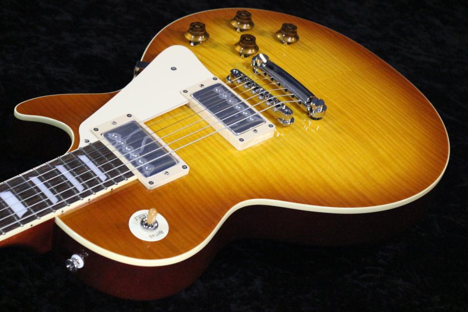 マホガニーバック・メイプルトップのボディ、マホガニーネックにローズウッド指板の定番スペックで、王道サウンドを体験できます。