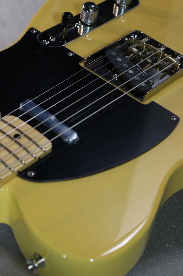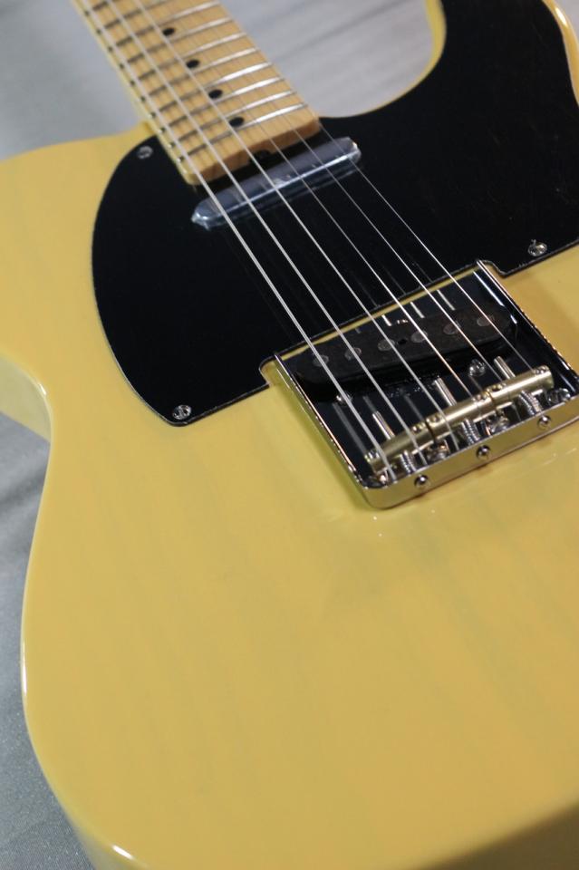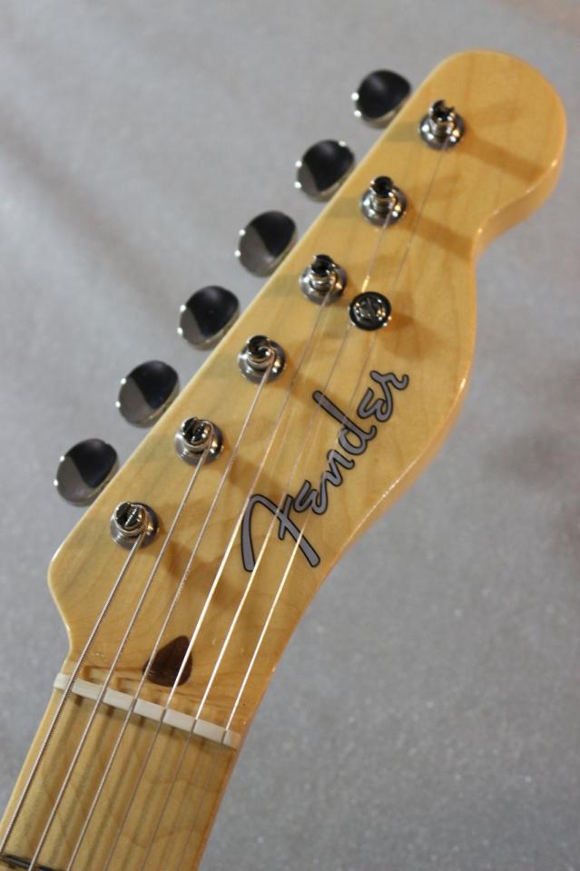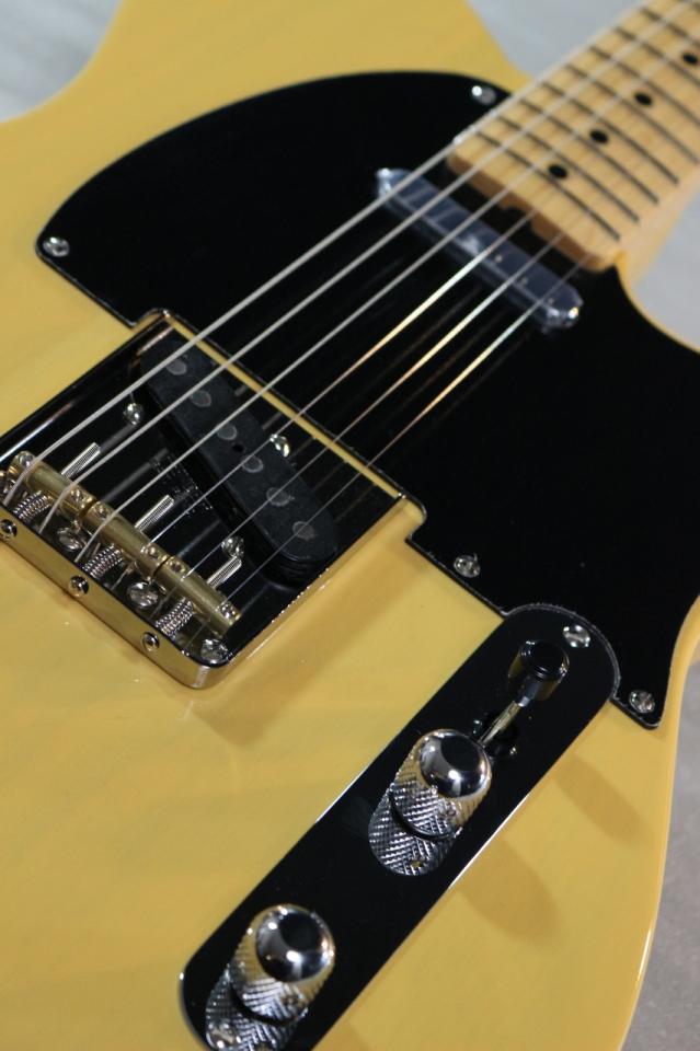 本機は、バタースコッチのカラーにブラックピックガードに加えて、ヘッドロゴは「Fender」のみの上張りデカール、マイナスネジを採用したノーキャスターといえばのルックスに仕上がっております。