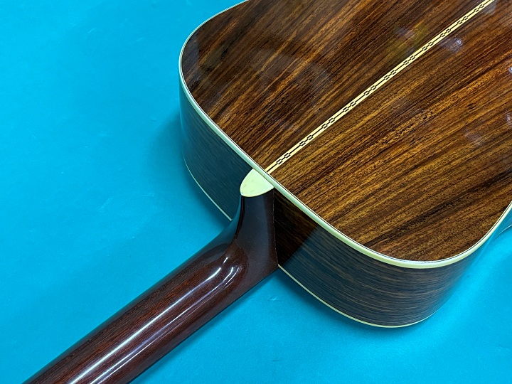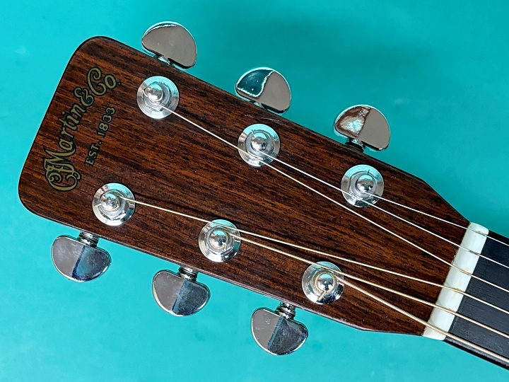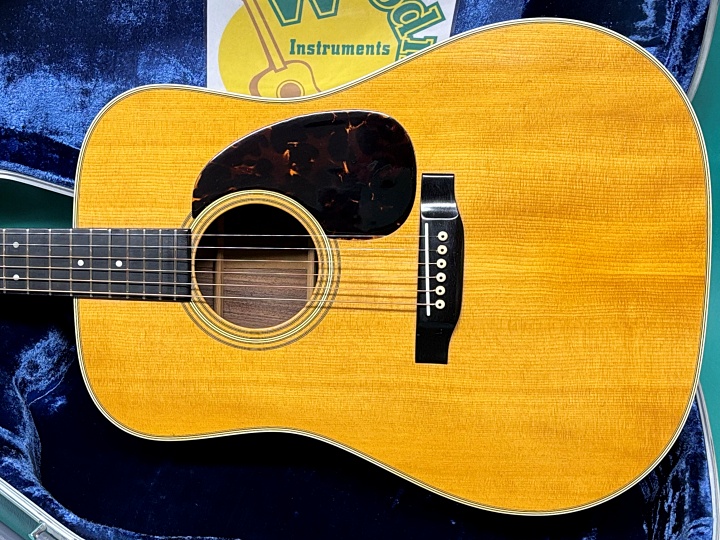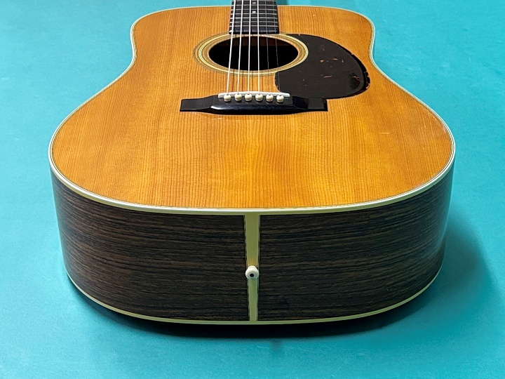 1975年ブルーケース時期のD-28ですが、ヘッドのシェイプを1960年代頃と同じ丸い形状にカスタムされていて、ピックガードは鼈甲風のものに交換されています。