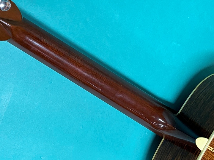 ヘッドをリシェイプしたときにヘッド裏からネックバック全体にオーバーラッカーされています。よく見ると塗装の中にウェザーチェックが見えています。