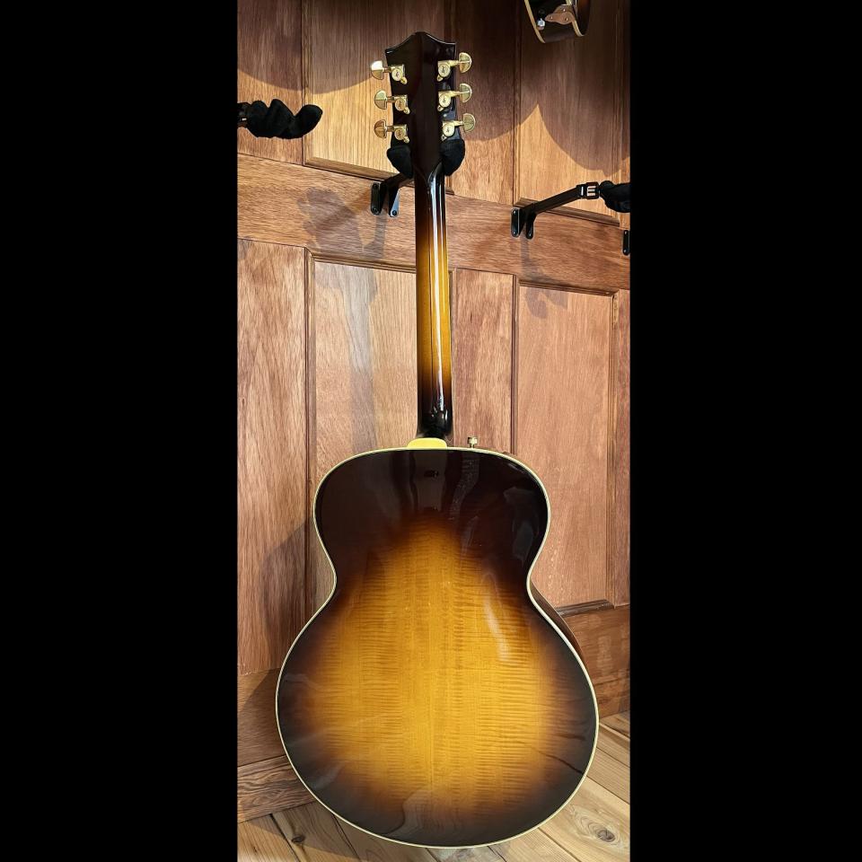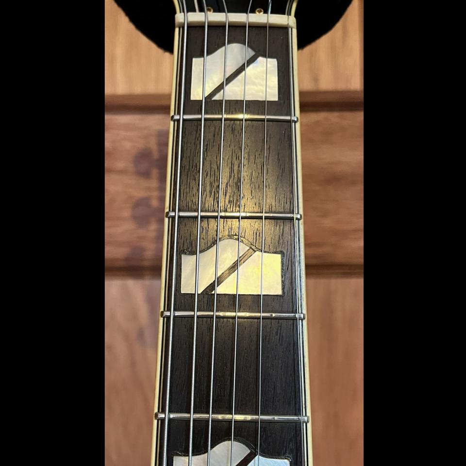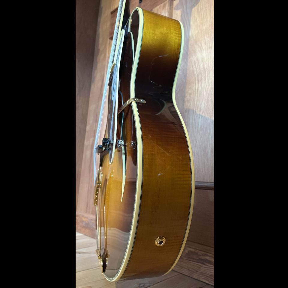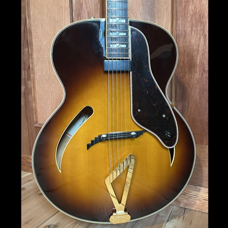 ノン・カッタウェイで17インチ幅に約87ミリ厚の深胴ボディは単板スプルース・トップに、杢目の美しい合板メイプル・サイド&バックの構成。Xブレーシング構造でアコースティックな鳴りが美しいギターです。特徴的なサウンドホールにシンクロマチック・テールピースとブリッジ、ピックガード形状はアールデコ・デザインの良さにあふれています。