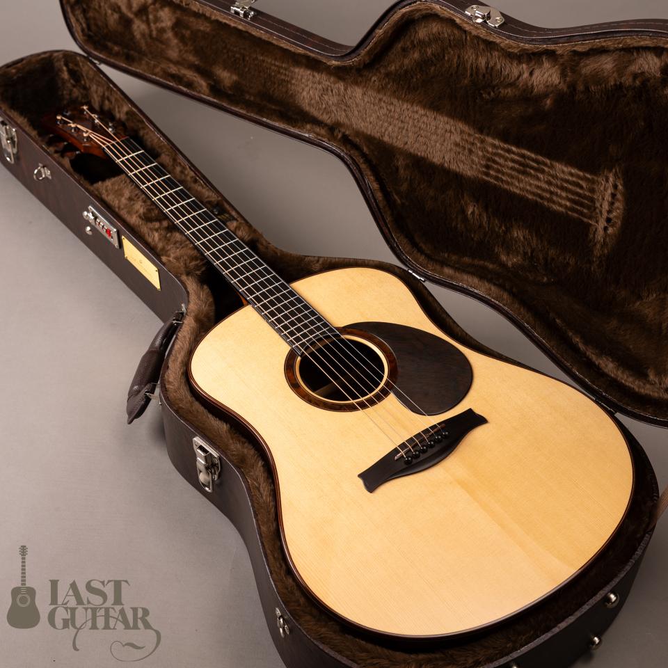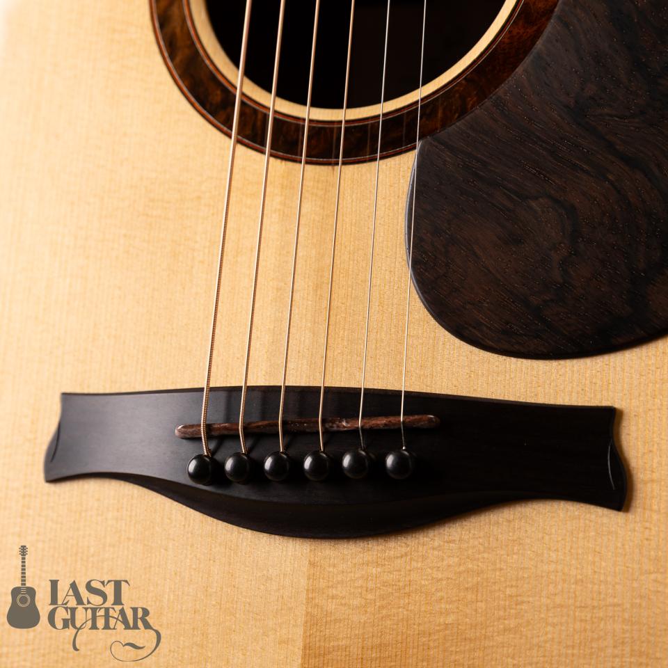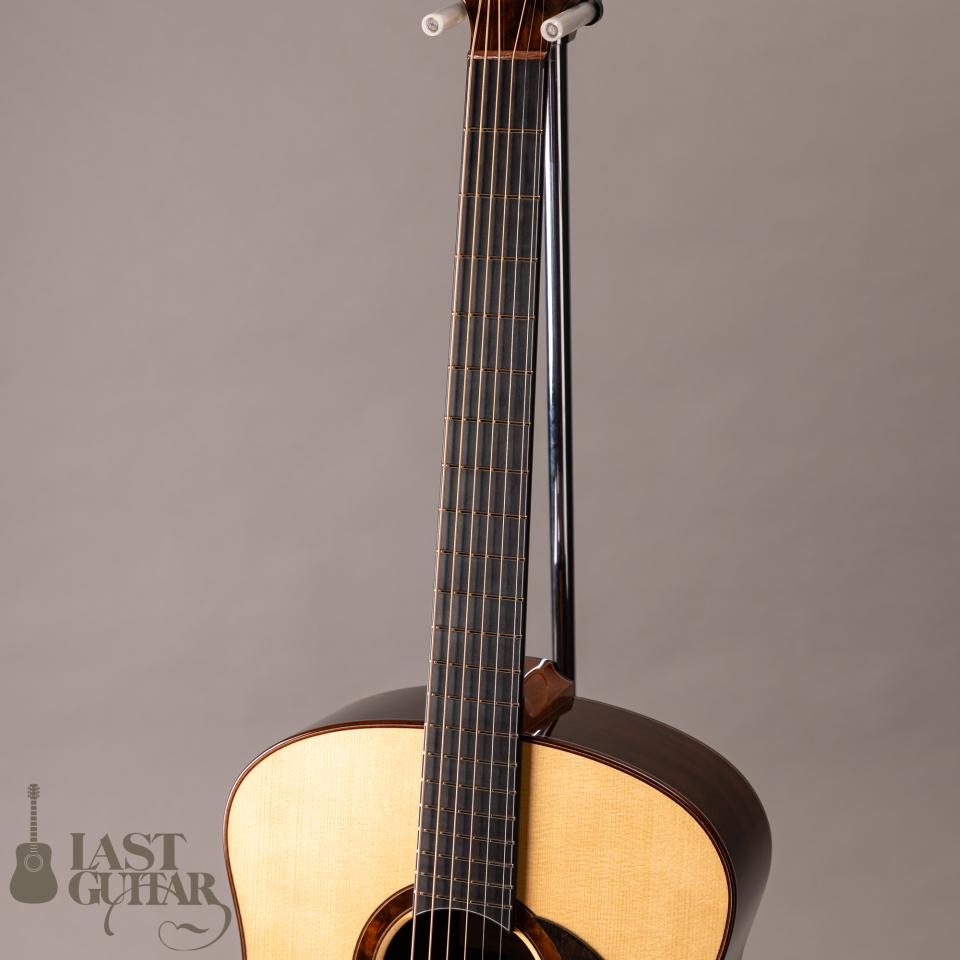 トップは、きれいに目の詰まった極上のジャーマンスプルース、サイドとバックは、メキシコなどの中南米が産地とされている高級材カタロックスが使用されております。バックセンターにサップが入って豪華で存在感抜群です。ネックは、密度の濃いマホガニー、フィンガーボードとブリッジは、黒く引き締まった良質なエボニーです。内部構造は、独自のスキャロップドXブレーシングで、バランス・反応の良いサウンドを生んでいます。ネックまわりにつきましては、44mmナット幅に、薄めのラウンドシェイプですっと握れる感じです。フィニッシュは、ニトロセルロースラッカーでとても美しく仕上げられています。ペグは、人気の高いゴトー510を搭載しておりつまみやすく、チューニングしやすいです。