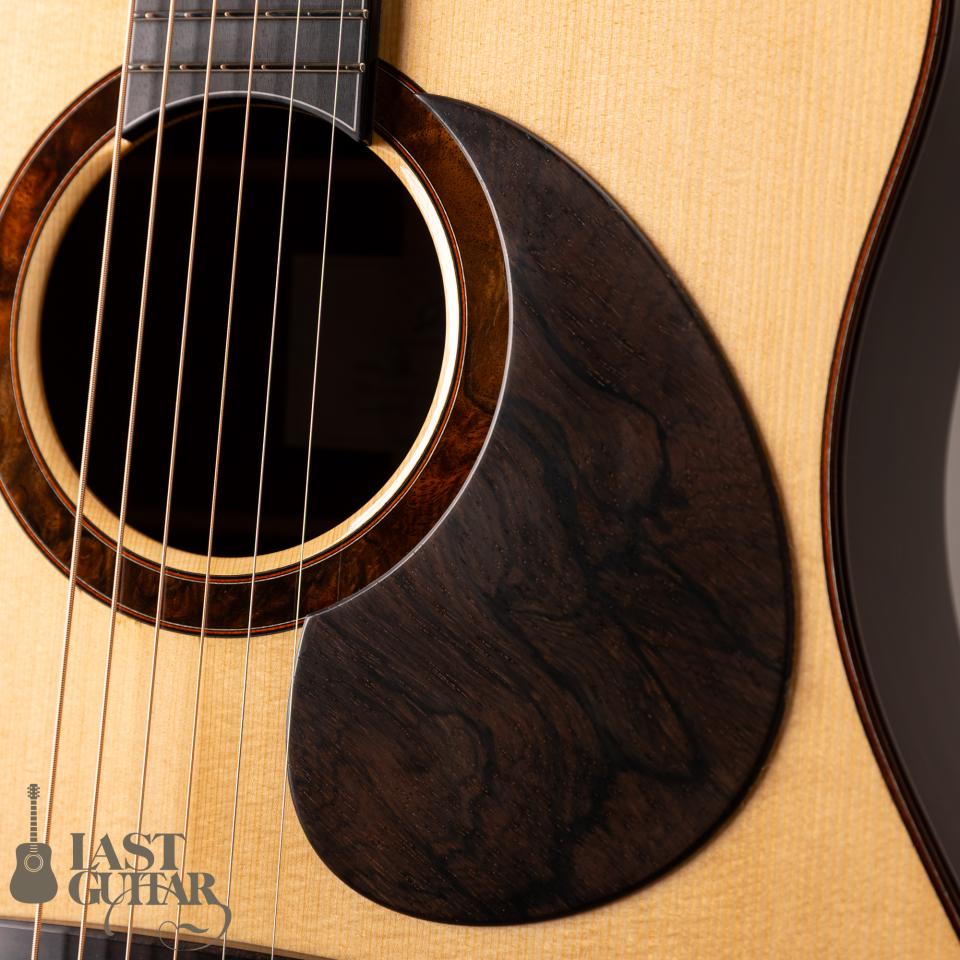 ルックス面を見てみますと、ヘッドとロゼッタは、ウォルナットバール材で渋くカッコいいです。またピックガードは、今回一般発売初となるモデルのため特別にハカランダ材が使用されております。模様が複雑なところがチョイスされており雰囲気抜群です。バインディングは、ローズウッド、ペグつまみは、グラナディロと全体に統一感がありシンプルで美しいです。また細かいところですが、ナットとサドルもブラウンカラーに染めてあり全体にマッチしています。ブランドネームの葉をイメージしたヘッドのロゴもさりげなくお洒落です。