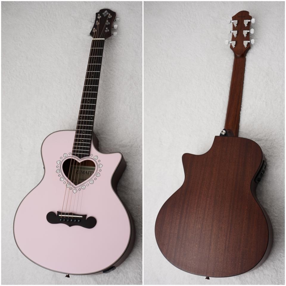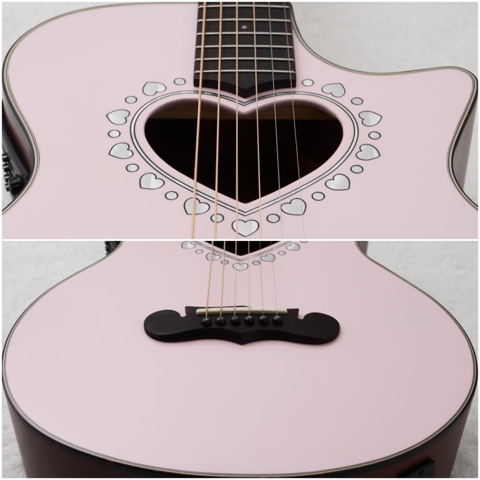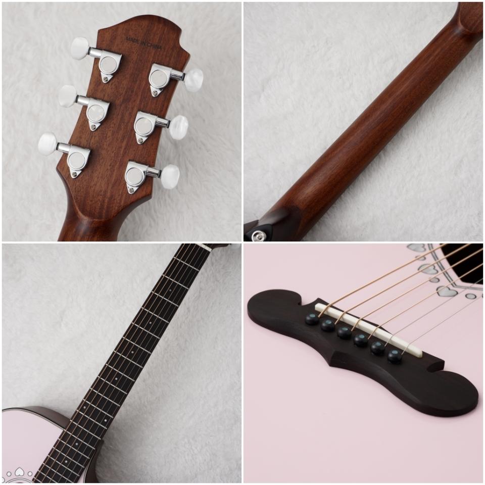 ハート型サウンドホールで演奏性に優れた600mmスケールを採用したCAM-90HCWは、マザー・オブ・パールのダイヤモンド・インレイが輝く特徴的なヘッドストックを持ったマホガニー・ネックにローズウッド・フィンガーボードを採用した20フレット仕様の14フレット・ジョイントで、誰にでも手軽に楽しめる小ぶりなミニ・ボディー・サイズのカッタウェイ・モデルのエレアコです。