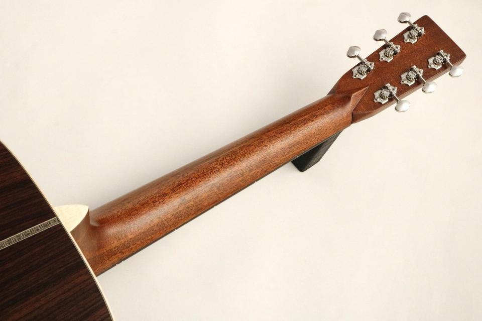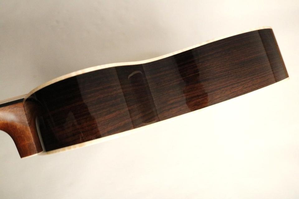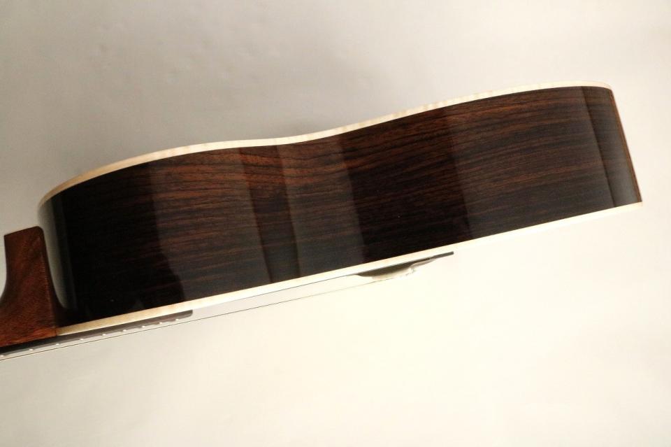 響きは素直な立ち上がりが感じられながらも安定感があり長い残響感を持って響いてくれます。低音の輪郭が鮮明で力強く響く為か000サイズの中でも大きく響いてくれるモデルに仕上がっています。安定した低音に包み込まれるように響き高音域は粒立ち・透明感に優れ、明るく透き通ったような上品な響きが感じられます。さらに中高音域の響きも非常にクリアな為単体で演奏するとすっきりとした印象もありますが、比較してみると音量と透明感に優れた まさに贅をつくした000-28という印象があります。スタンダードシリーズになれている方からすると少々癖のあるネックシェイプですが是非000-28をご検討されていた方に候補に入れて頂きたい一本です。