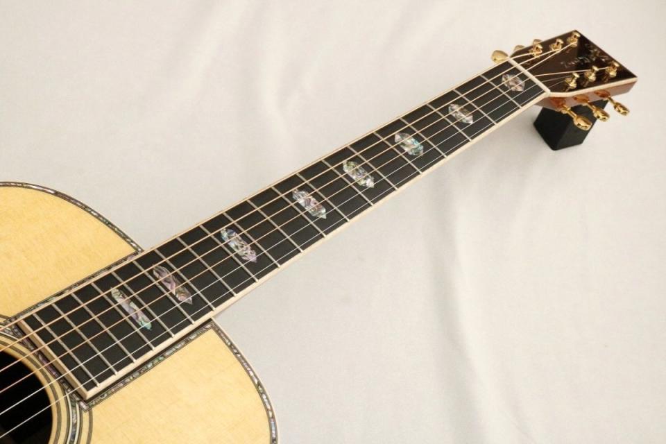 味のある外観のエイジングトナーのトップフィニッシュに、最高グレードの杢目が整った美しいシトカスプルース。サイド・バックには同じく最高グレードのインディアンローズウッド。濃い色味とまっすぐに入ったストライプは見ているだけでも楽しめる美しさ。最高グレードの木材をまとめる煌びやかなアバロンインレイと極上フレームの入ったメイプル材を贅沢にバインディングに使用することで、豪華絢爛な外観をしっかりと纏め、バランスの面でも美しさを感じる外観になっています。